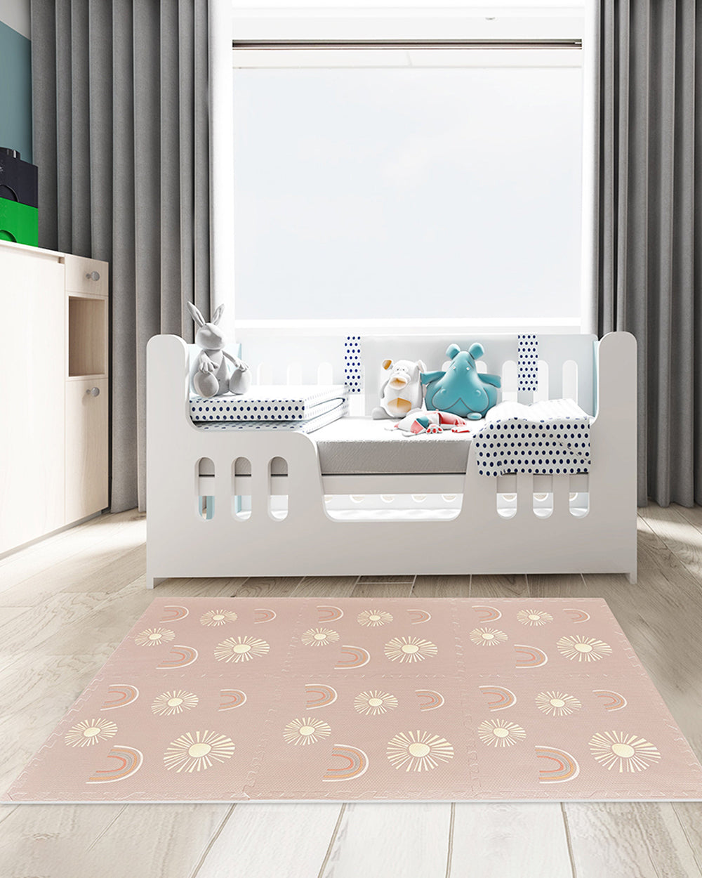 The Cheerful Rainbow Baby Play Mat is a beautifully padded, quilted cotton mat that offers a warm and secure space for infants. Crafted from 100% combed cotton, it flaunts a delightful rainbow-themed pattern that supports sensory play and enhances comfort during tummy time and general play.