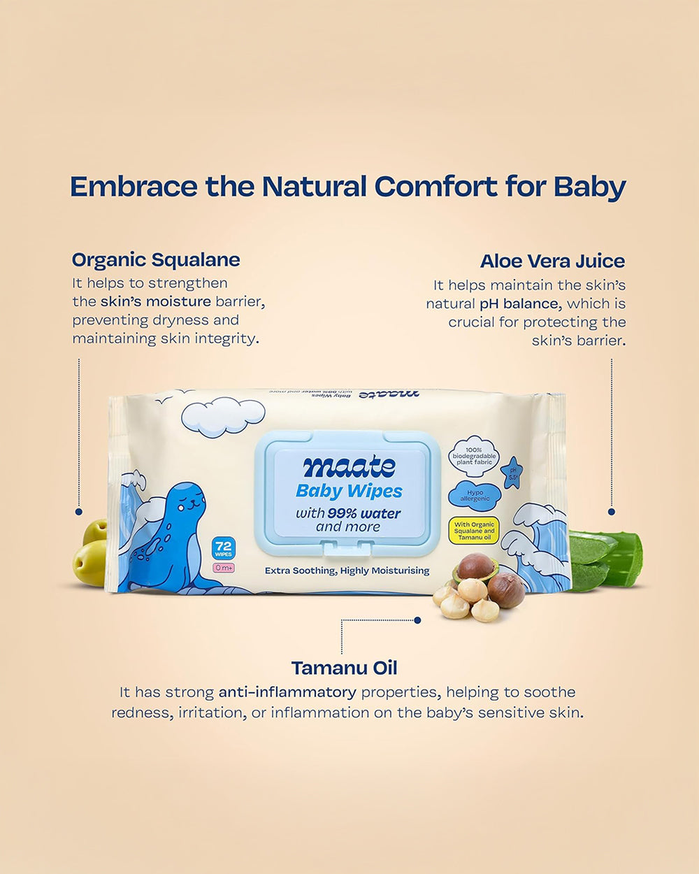 Maate Baby Wipes-Infused With Plant Squalane, Tamanu Oil & Aloe Vera-Soothing & Hypoallergenic