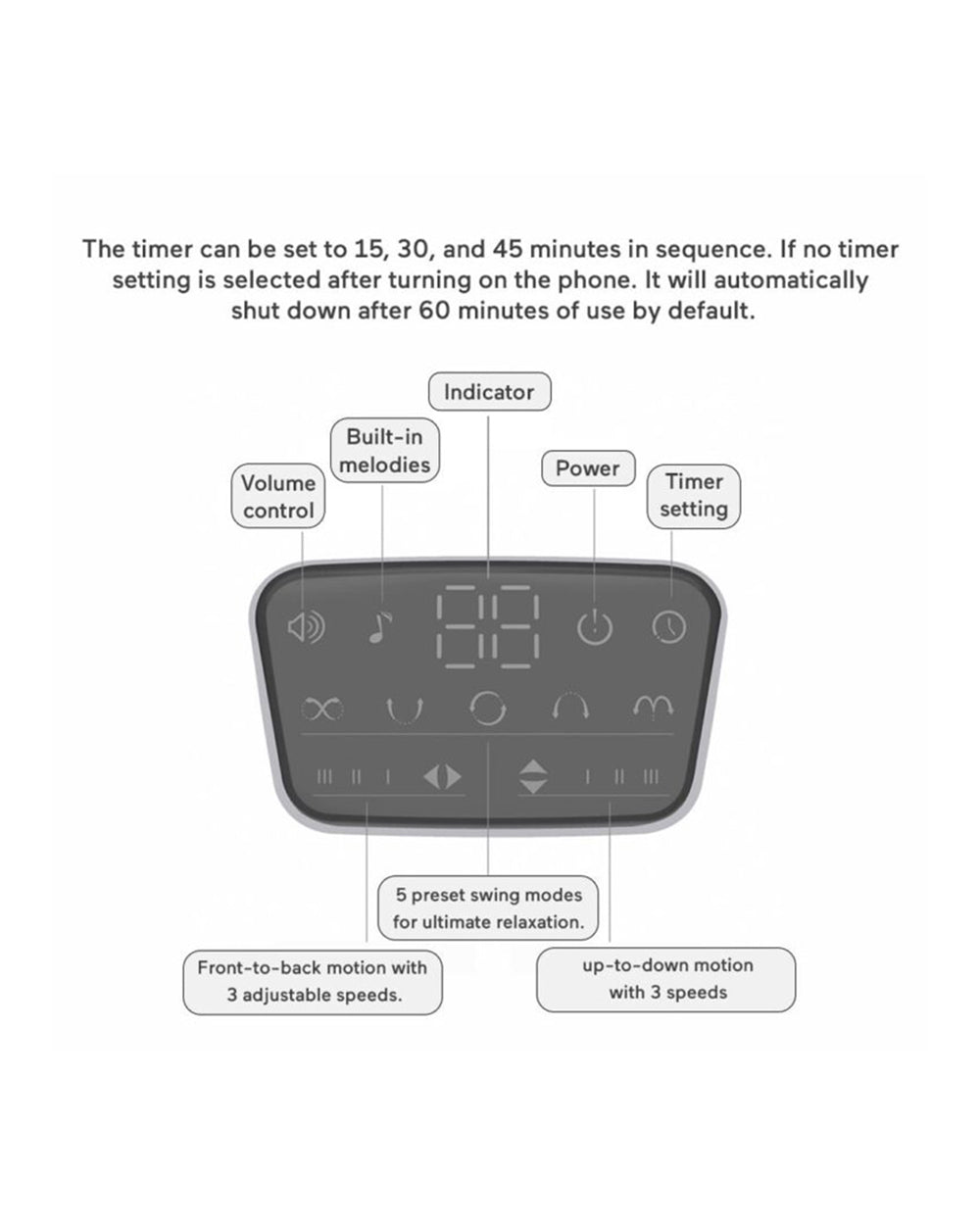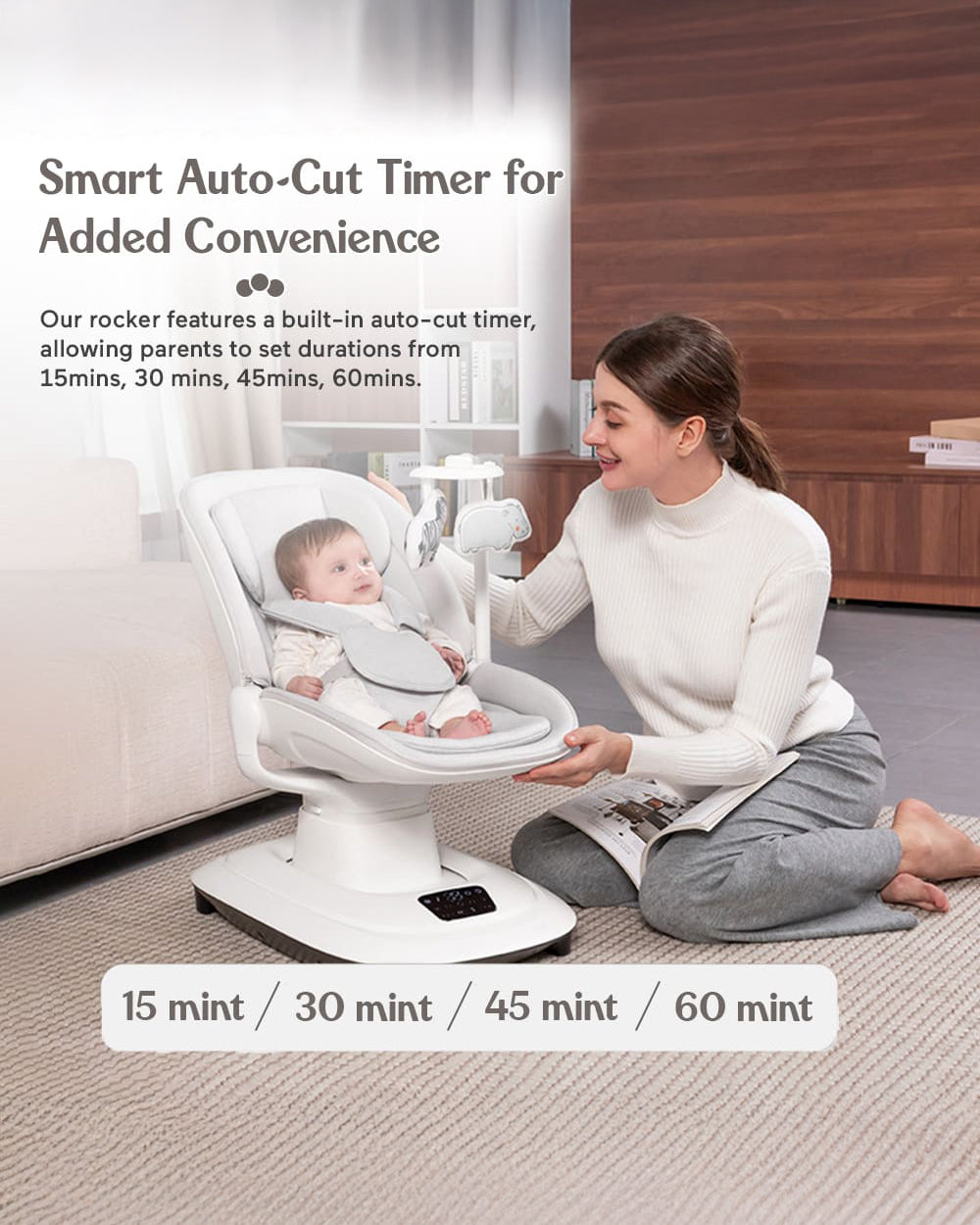 • Timer Functionality: Set swing durations of 15, 30, or 45 minutes to match your baby's sleep routine.