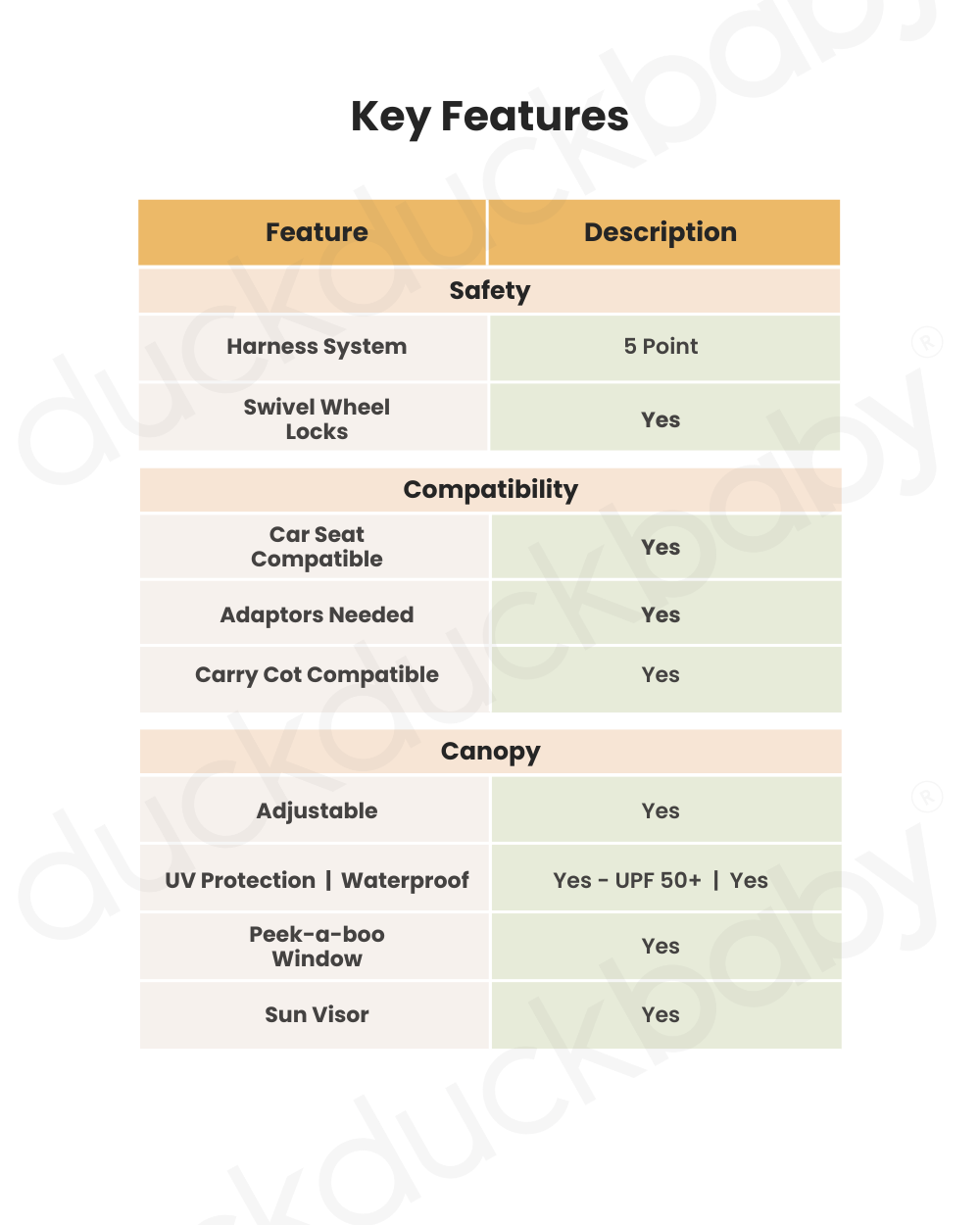 • 5-Point Safety Harness: A secure, adjustable 5-point harness ensures your child stays snug and safe while they explore the world in their stroller.