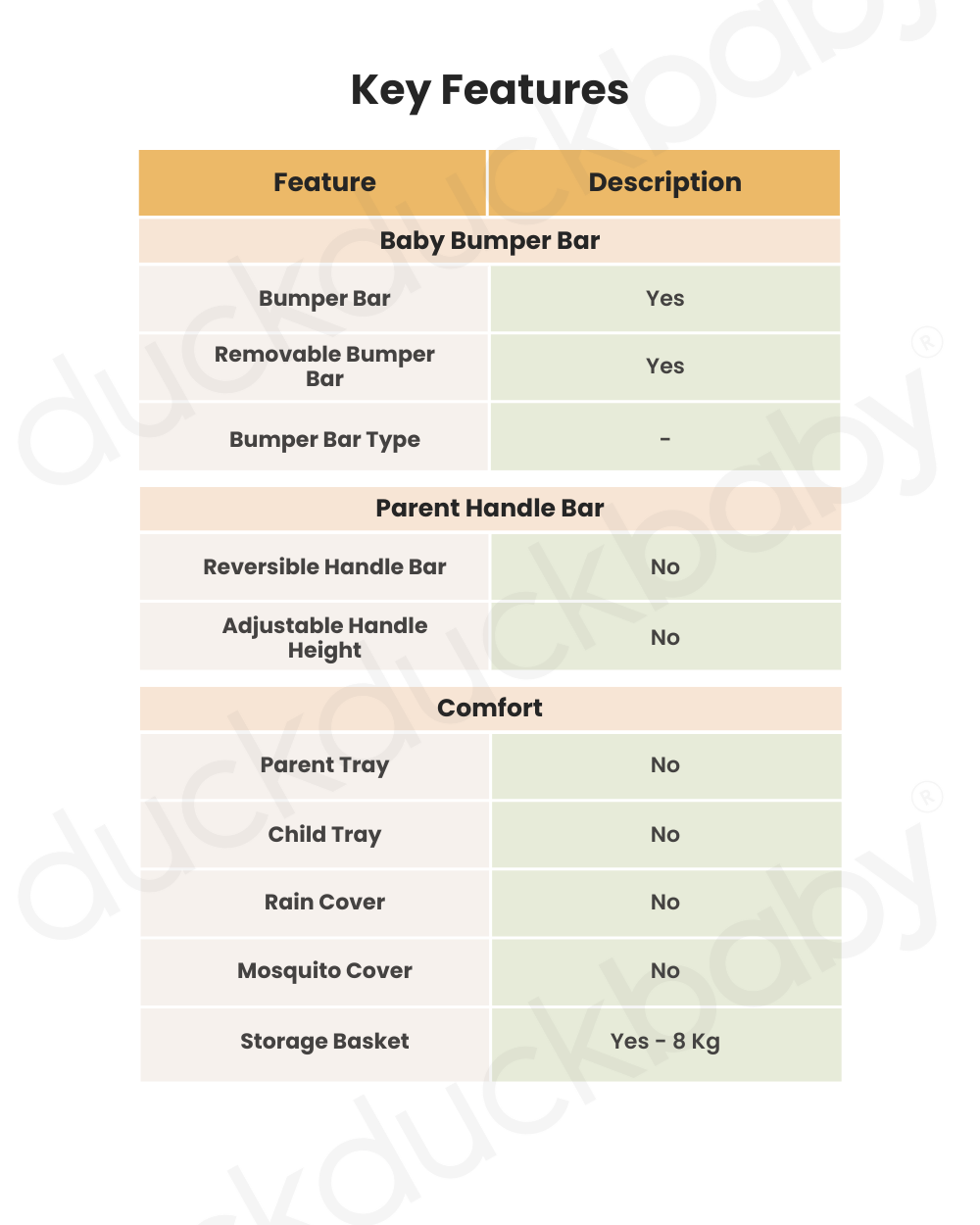 • Adjustable Features: The pivotable bumper bar and adjustable push bar offer customizable comfort for parents and little ones, making each stroll more ergonomic.