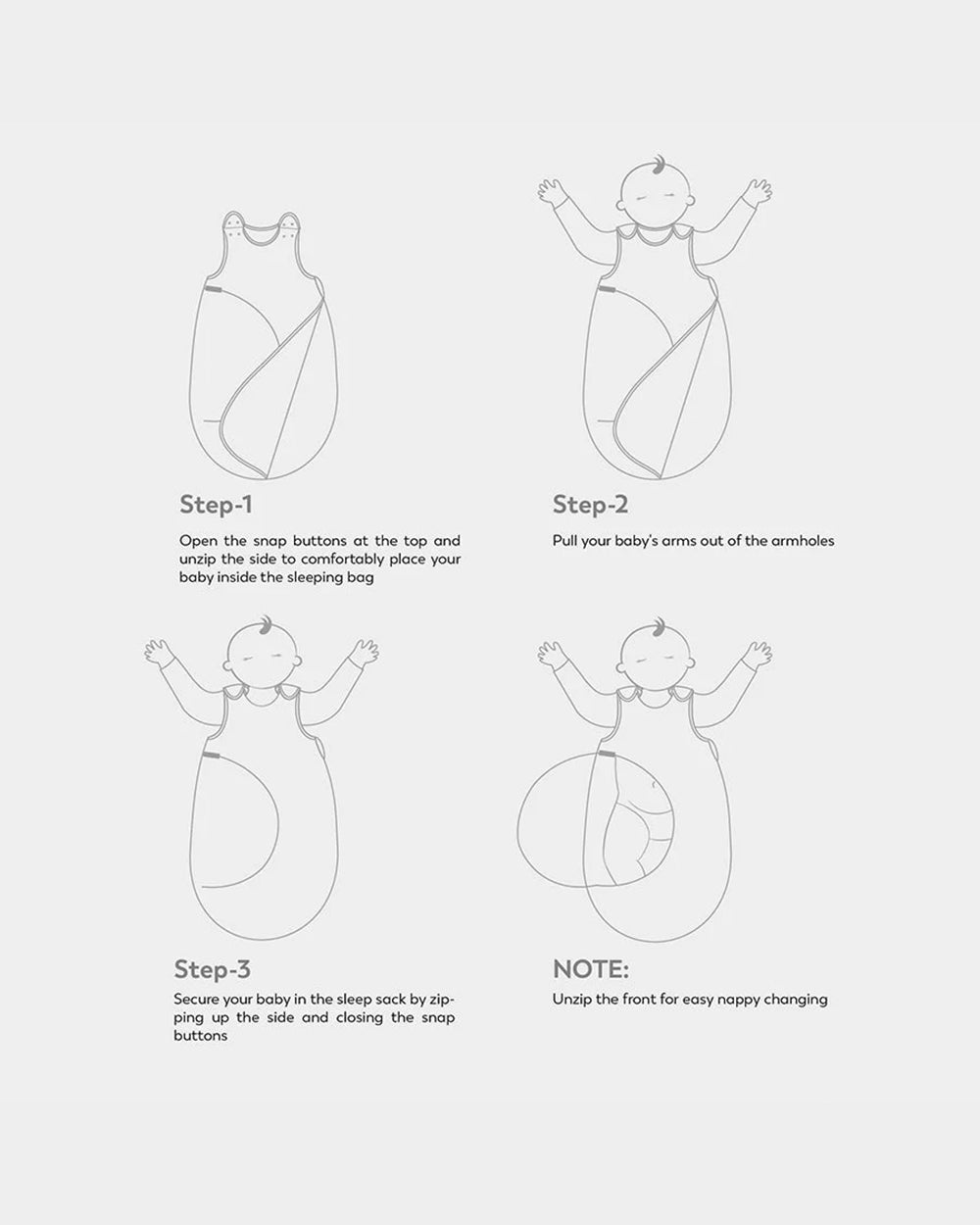 • Snap-Button Fasteners & Side Zipper: Shoulder snap buttons and a side zipper make it easy to open for nappy changes without disturbing your little one's sleep.