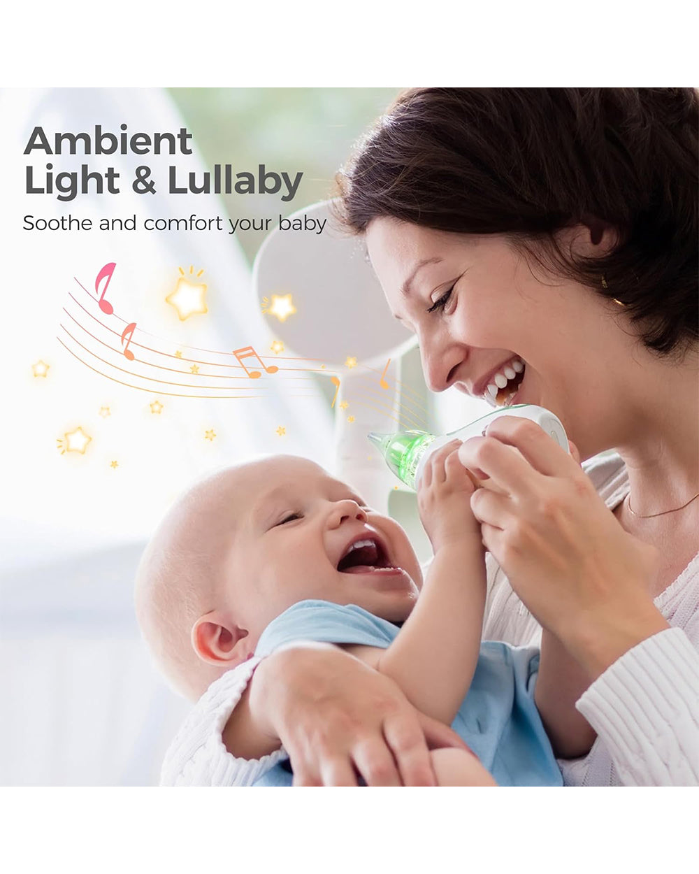 • Soothing Lullabies and Lights: Features 3 lullabies and a light function to comfort and distract the baby during use.