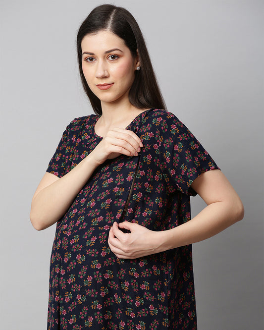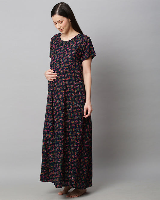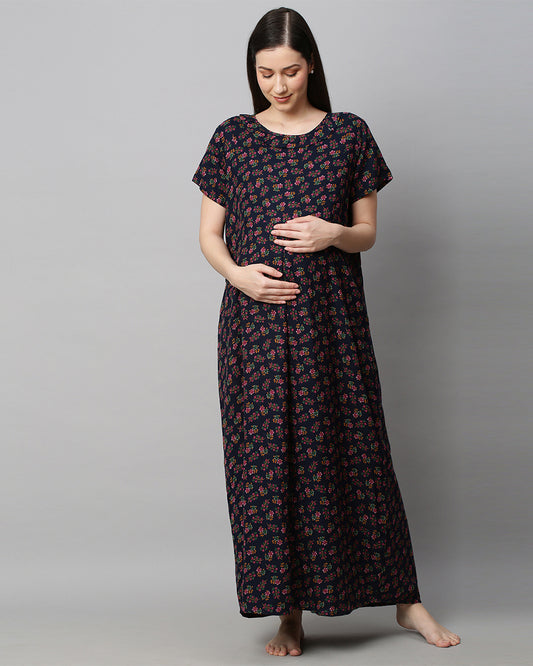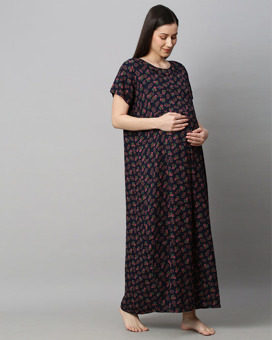 MomToBe Purple Maternity Nursing Nighty-Floral Print-Cotton Blend-Sweetheart Neck-Bump Friendly