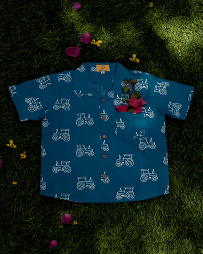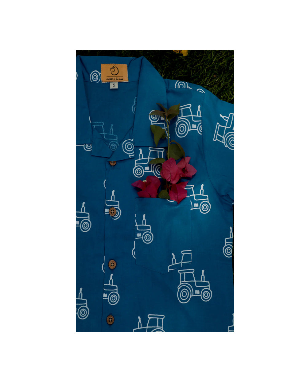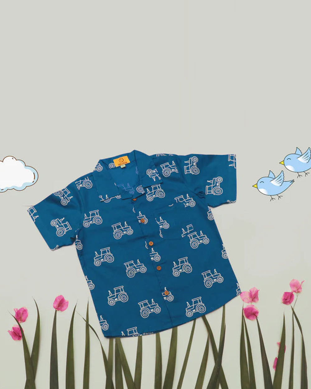 Mouse in the House Indigo Shirt-Tractor Print-Cotton-For Infants