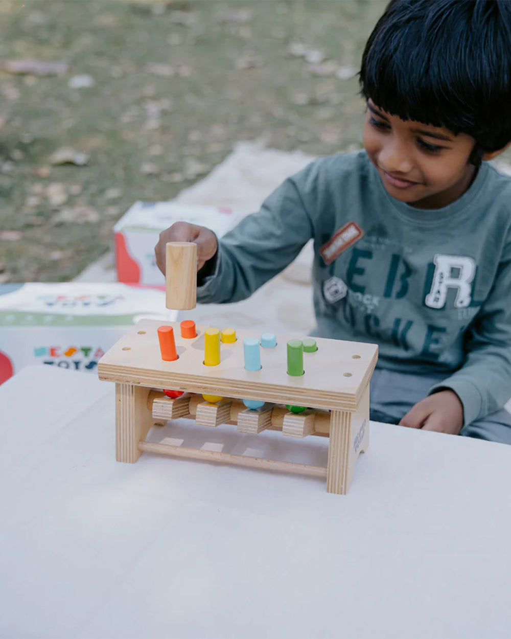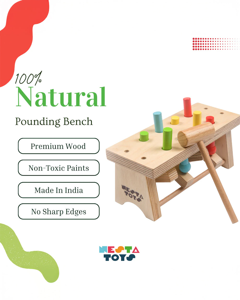 Nesta Toys Pounding Bench Wooden Toy with Hammer-Promotes Hand Coordination-Pretend & Play Toy-12M+