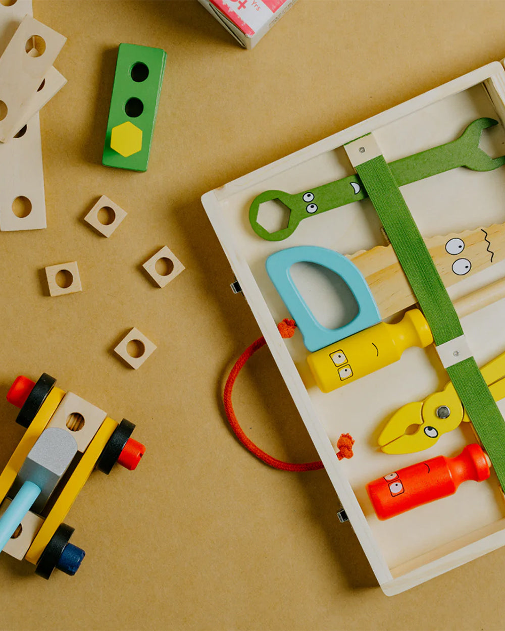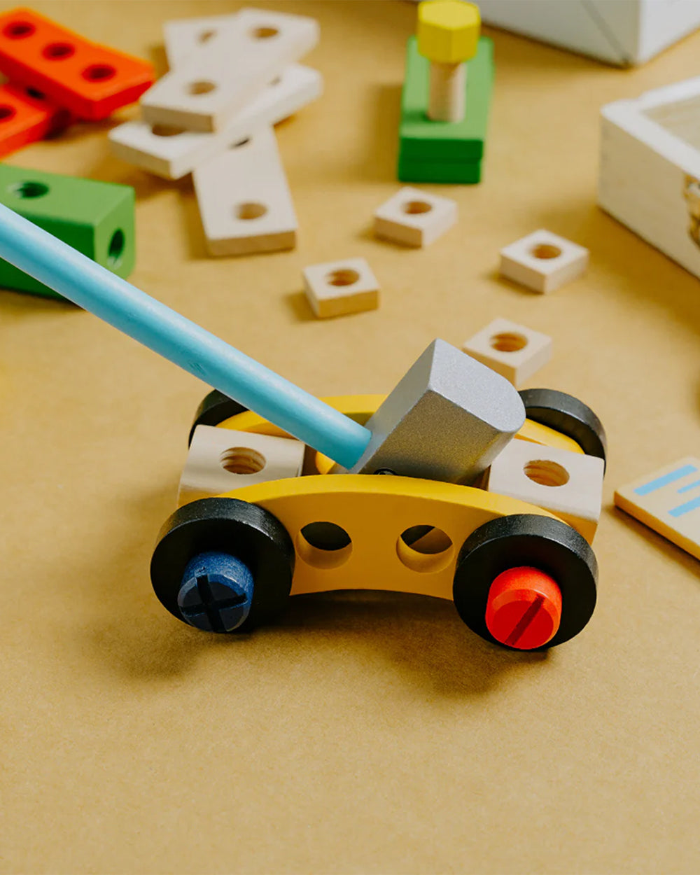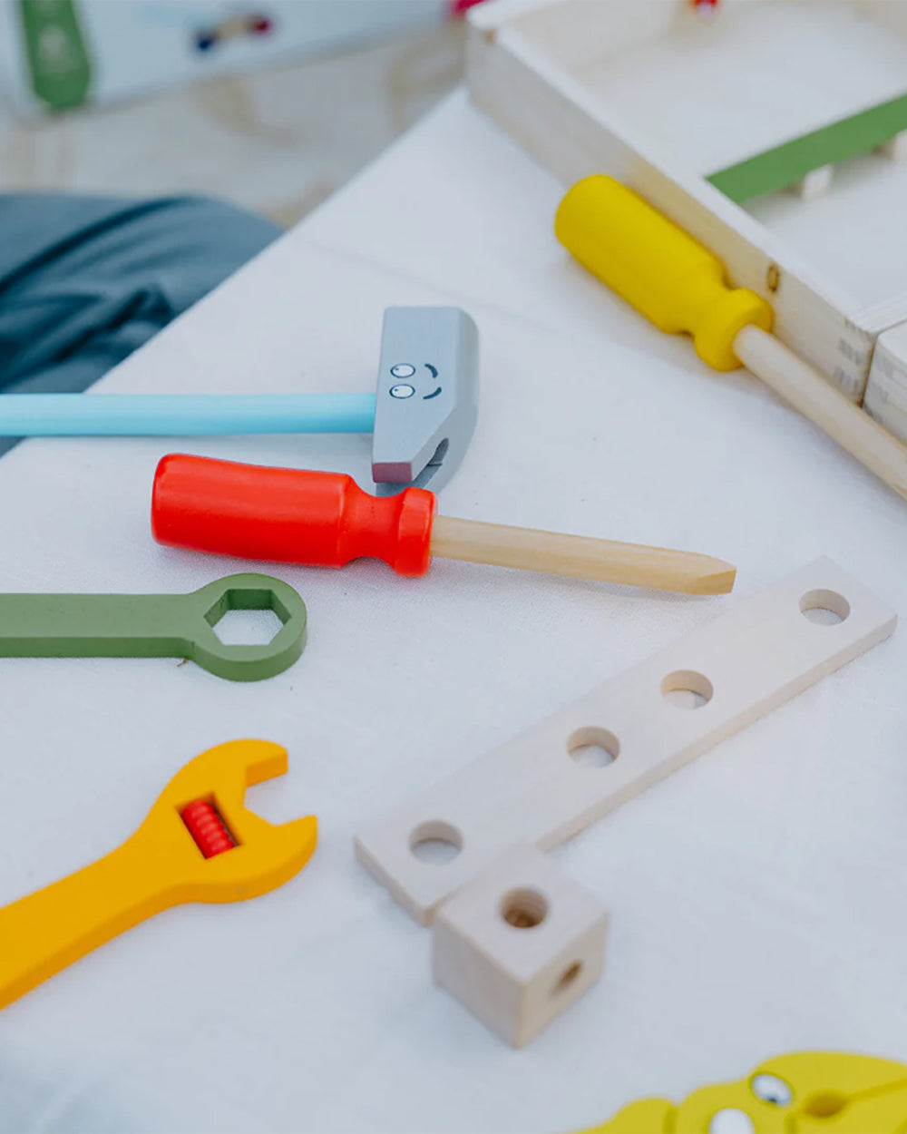 1x Wooden Tool Box, 2x Wrench, 1x Pliers, 1x Hammer, 1x Saw, 1x Ruler, 9x Assembly Pieces, 3x Building Blocks, 4x Wheels, 6x Bolts & 5x Nuts
