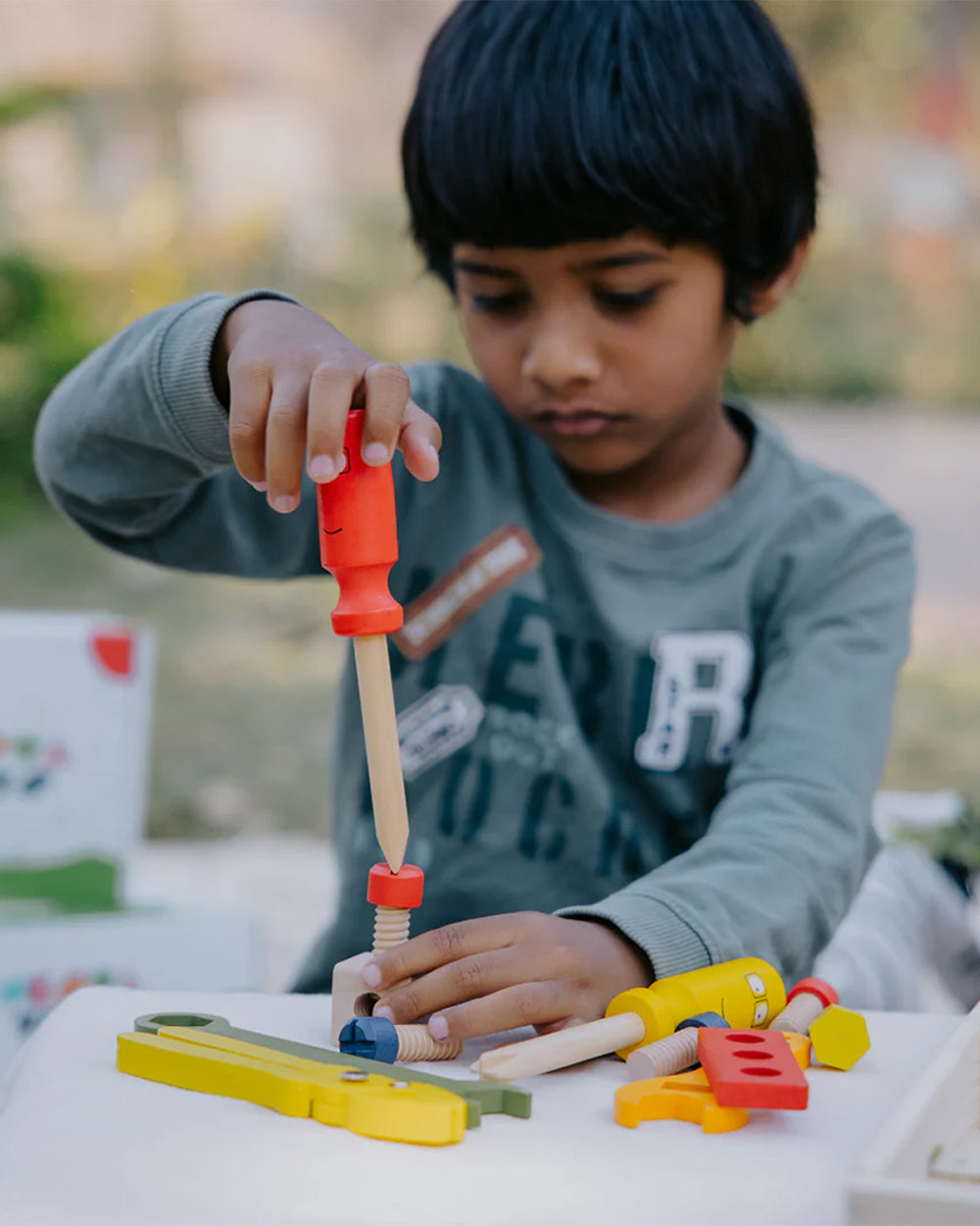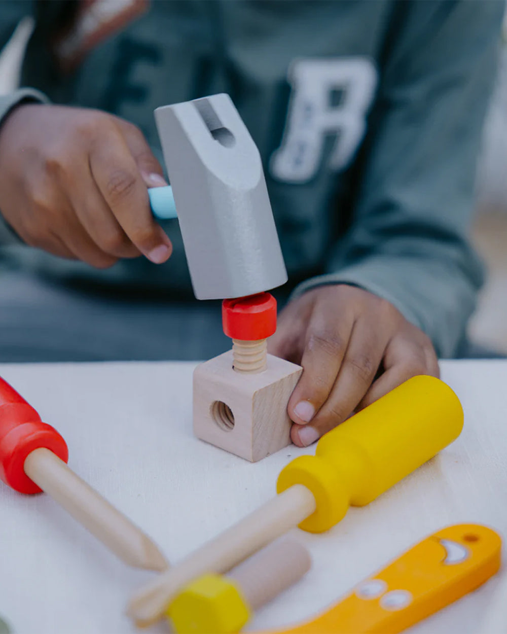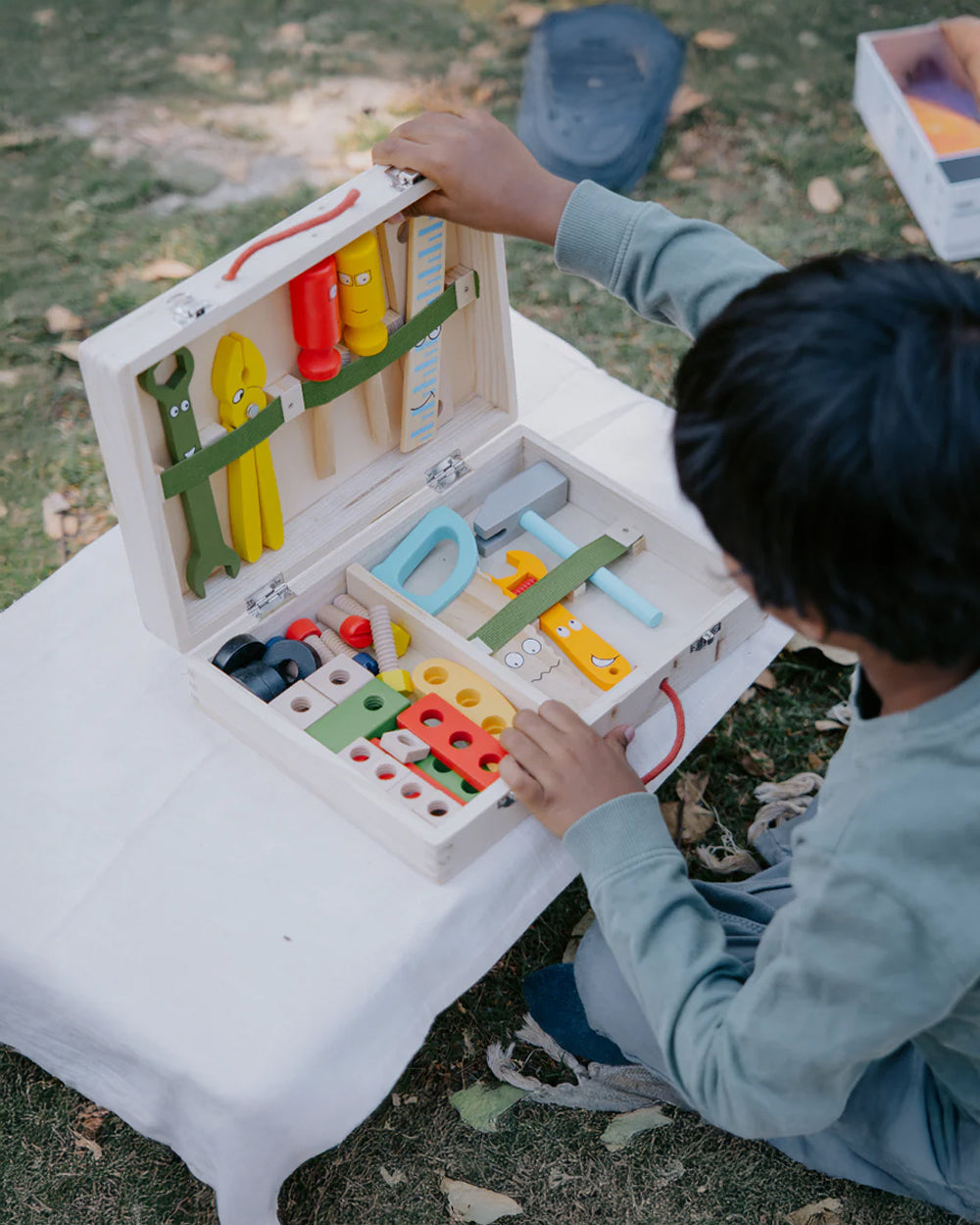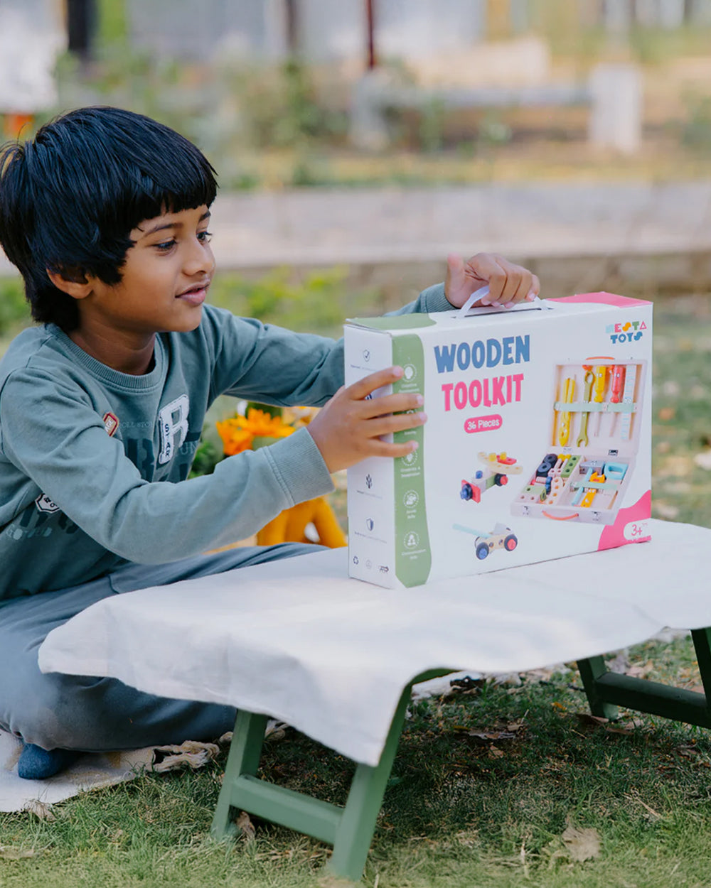 1x Wooden Tool Box, 2x Wrench, 1x Pliers, 1x Hammer, 1x Saw, 1x Ruler, 9x Assembly Pieces, 3x Building Blocks, 4x Wheels, 6x Bolts & 5x Nuts