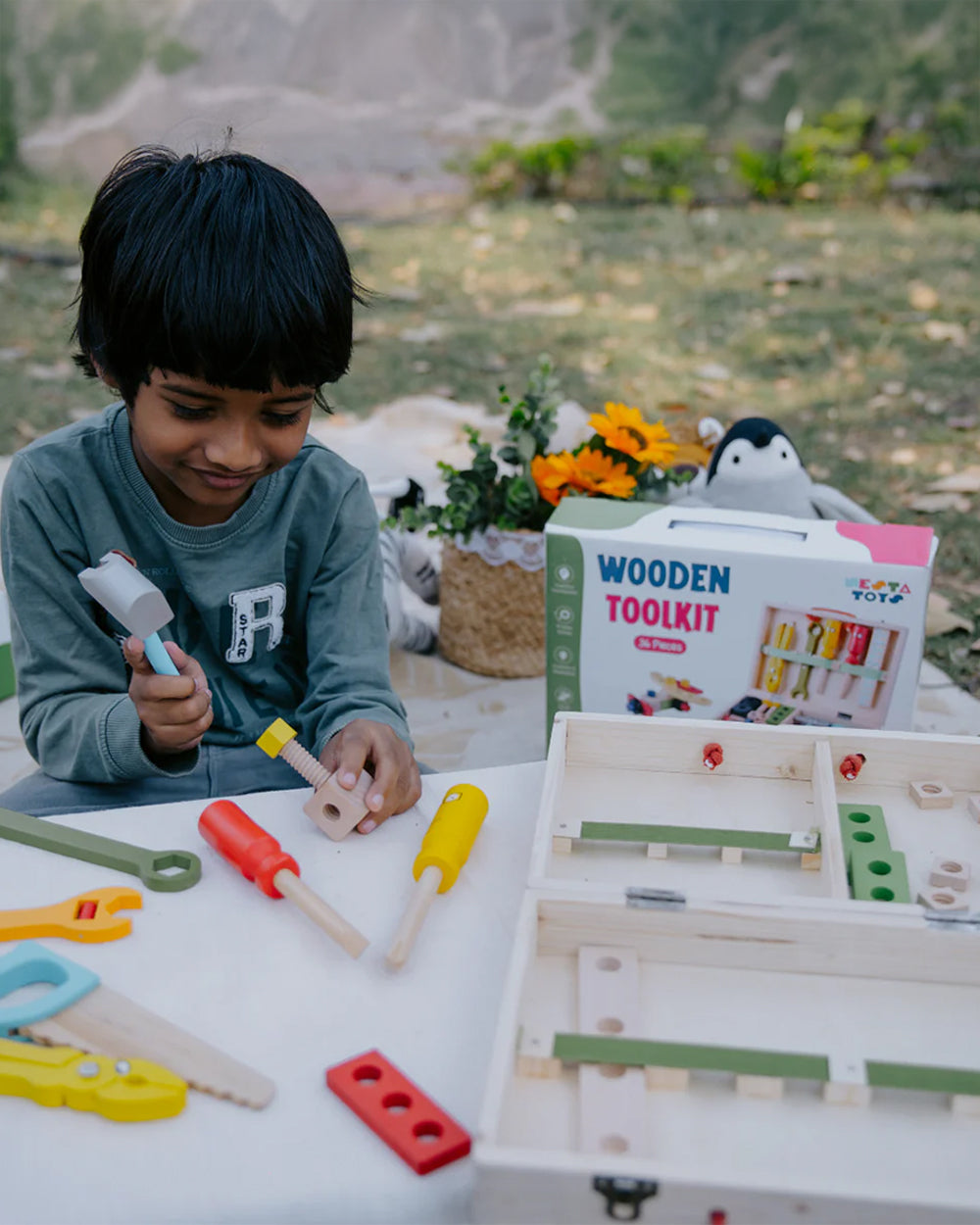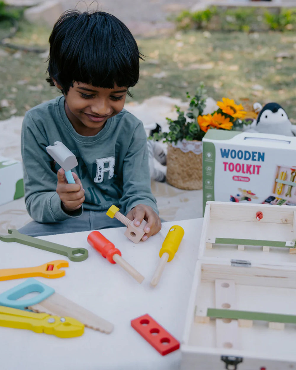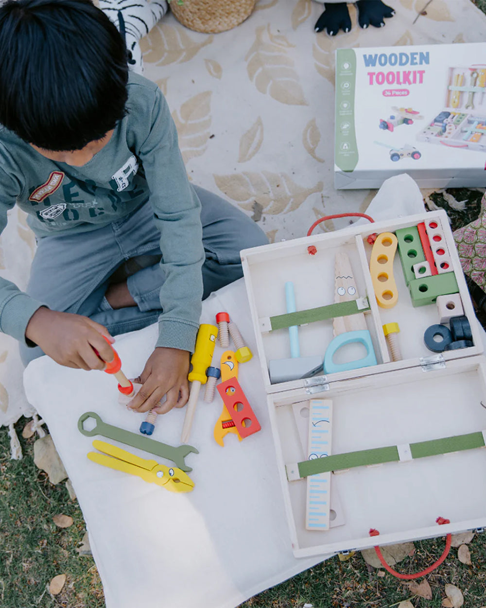 Introduce Your Child to Building Fun! Spark your child's imagination and problem-solving skills with our Wooden Tool Kit! This fun 33-piece set is perfect for little builders who want to hammer, screw, measure, and create. It offers a safe way for kids to learn about real tools while having a blast.