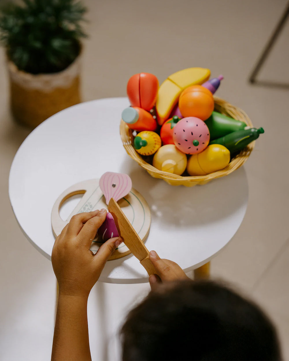 • Skill development: To further enhance the play experience, the set includes a wooden knife and cutting board. Children can use the knife to slice through the fruits and vegetables, giving them a sense of involvement in meal preparation. As they cut through the pieces, they can practice their fine motor skills and hand-eye coordination while learning about the concept of slicing and chopping.