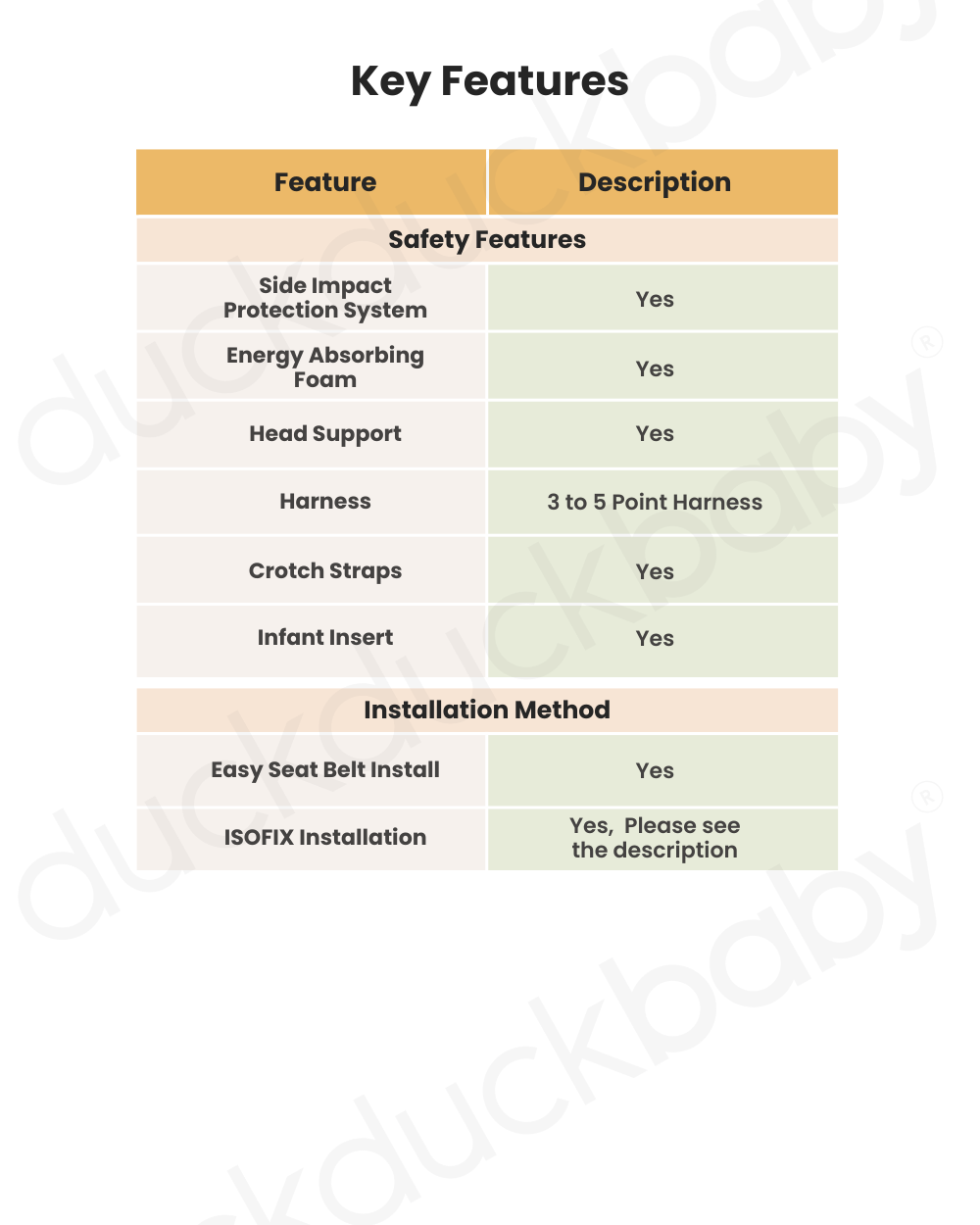 • Energy-Absorbing Foam: EPP foam enhances side-impact security, providing added protection in case of a collision.