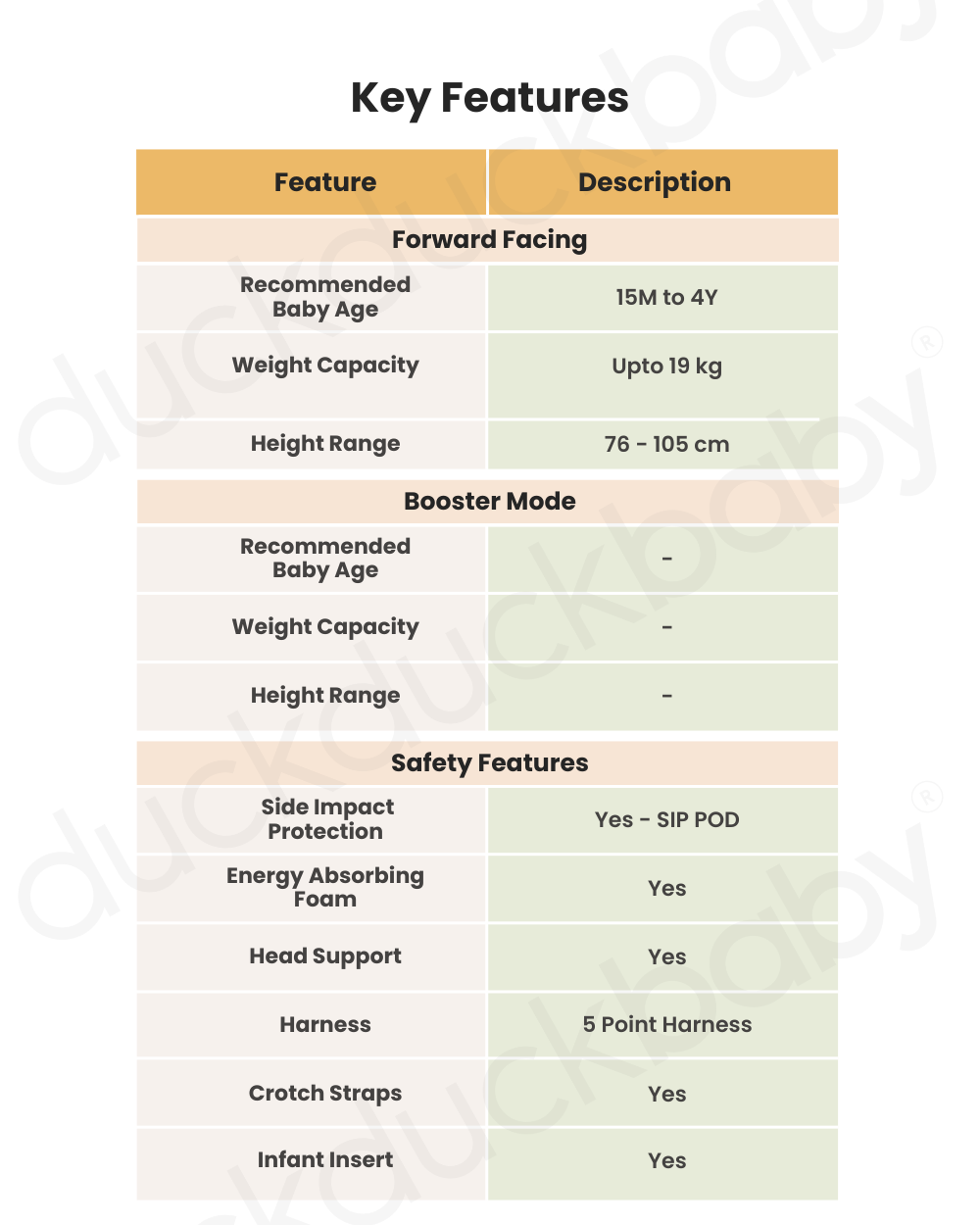 • Forward-Facing: Child height: 76–105 cm, under 19 kg