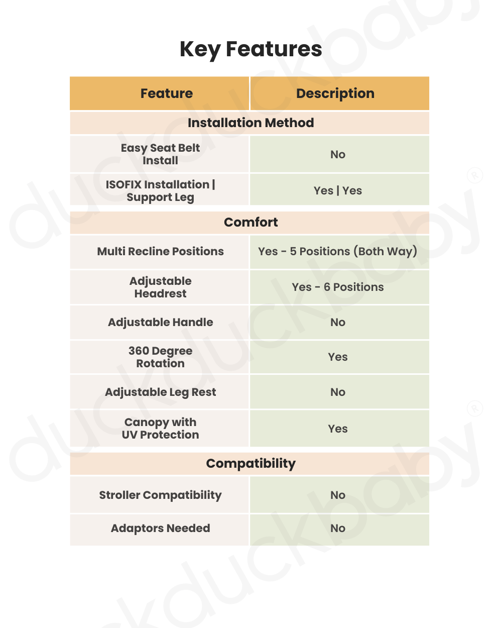 • Smart-Swivel Lock: Ensures the seat stays rear-facing until at least 15 months for maximum safety.