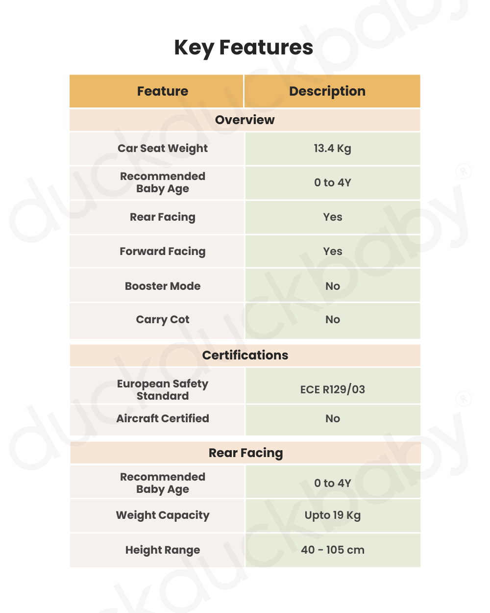 • Rear-Facing: Child height: 40–105 cm, under 19 kg