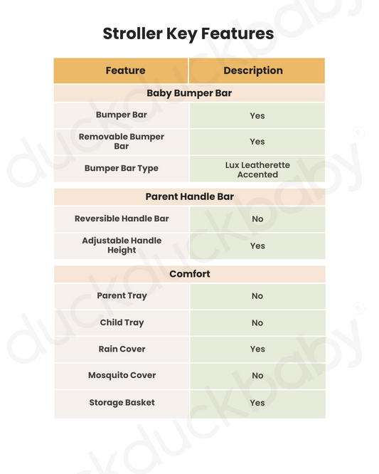 • Elegant Accents: Features luxe leatherette details on the pushbar and a removable armbar, adding a touch of sophistication to your adventures.