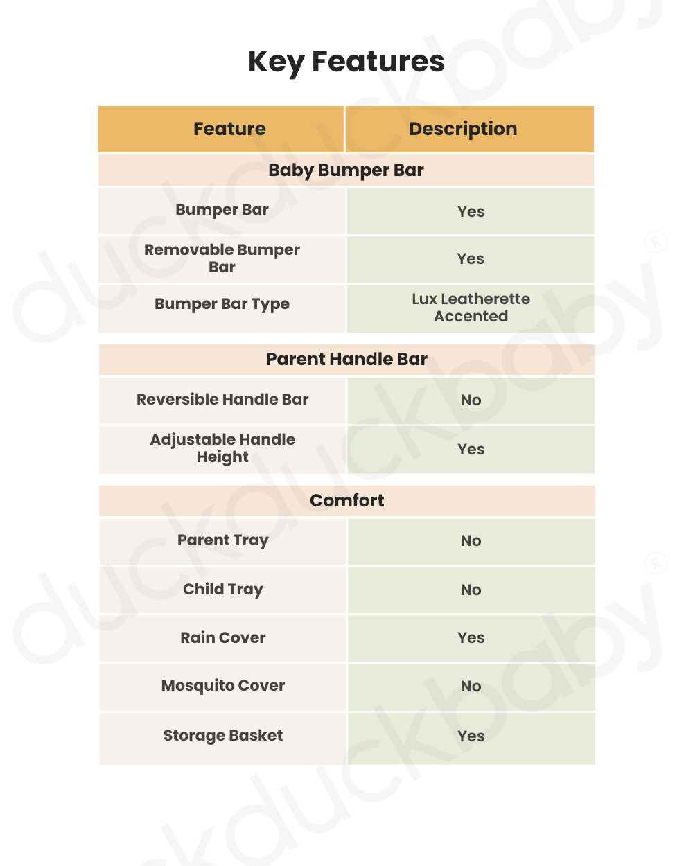 • Elegant Accents: Features luxe leatherette details on the pushbar and a removable armbar, adding a touch of sophistication to your adventures.