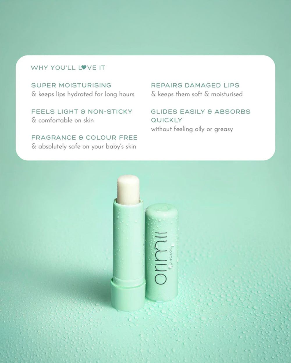Orimii First Kiss Moisturising Lip Balm is a fragrance-free, non-tinted lip balm designed for the softest, most nourishing care. Made with skin-loving ingredients like Beeswax, Shea Butter, and Vitamin E, it deeply hydrates dry, chapped lips—leaving them smooth, supple, and kiss-ready. Gentle enough for use around babies, it's crafted for worry-free moments of love, cuddles, and care.