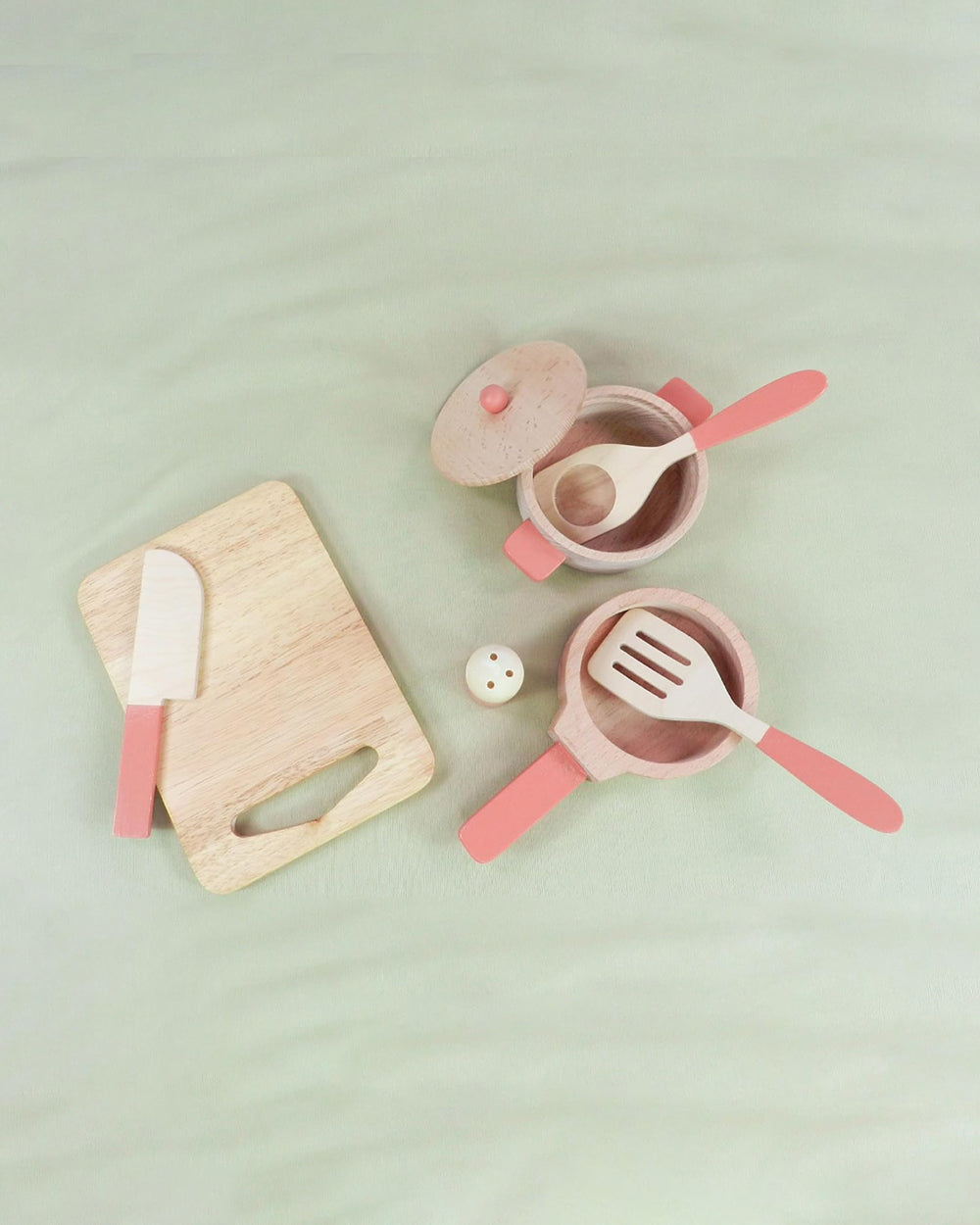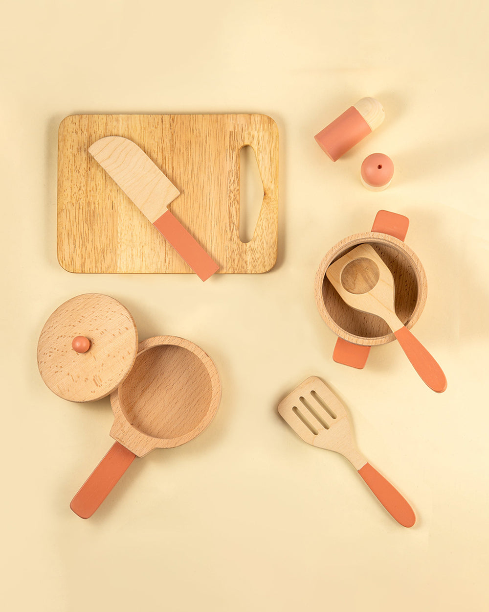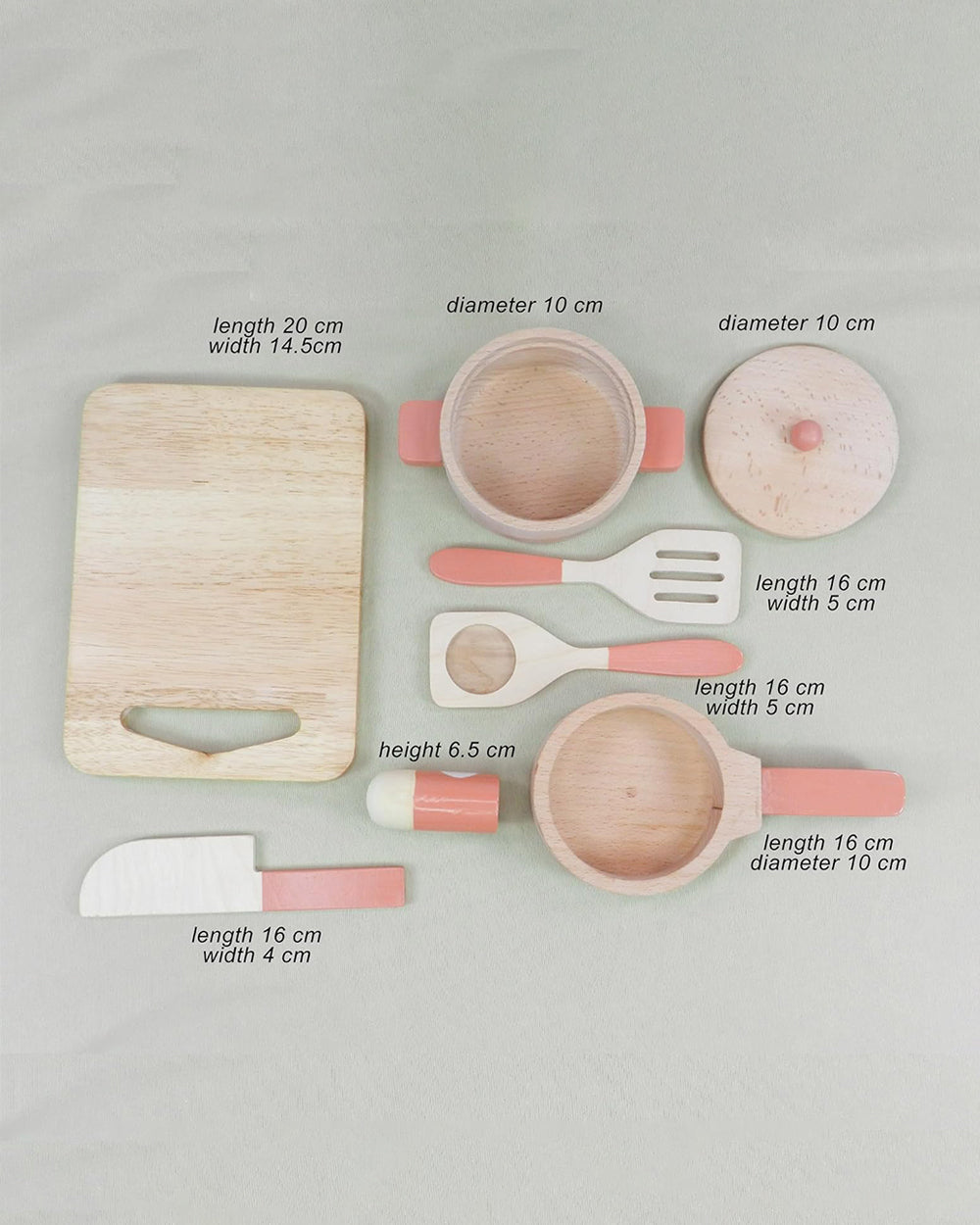 1x Chopping board, 1x Child safe wooden knife, 1x Salt, 1 Pepper, 1x Spoon, 1x Spatula, 1x Pan, 1x Pot with lid