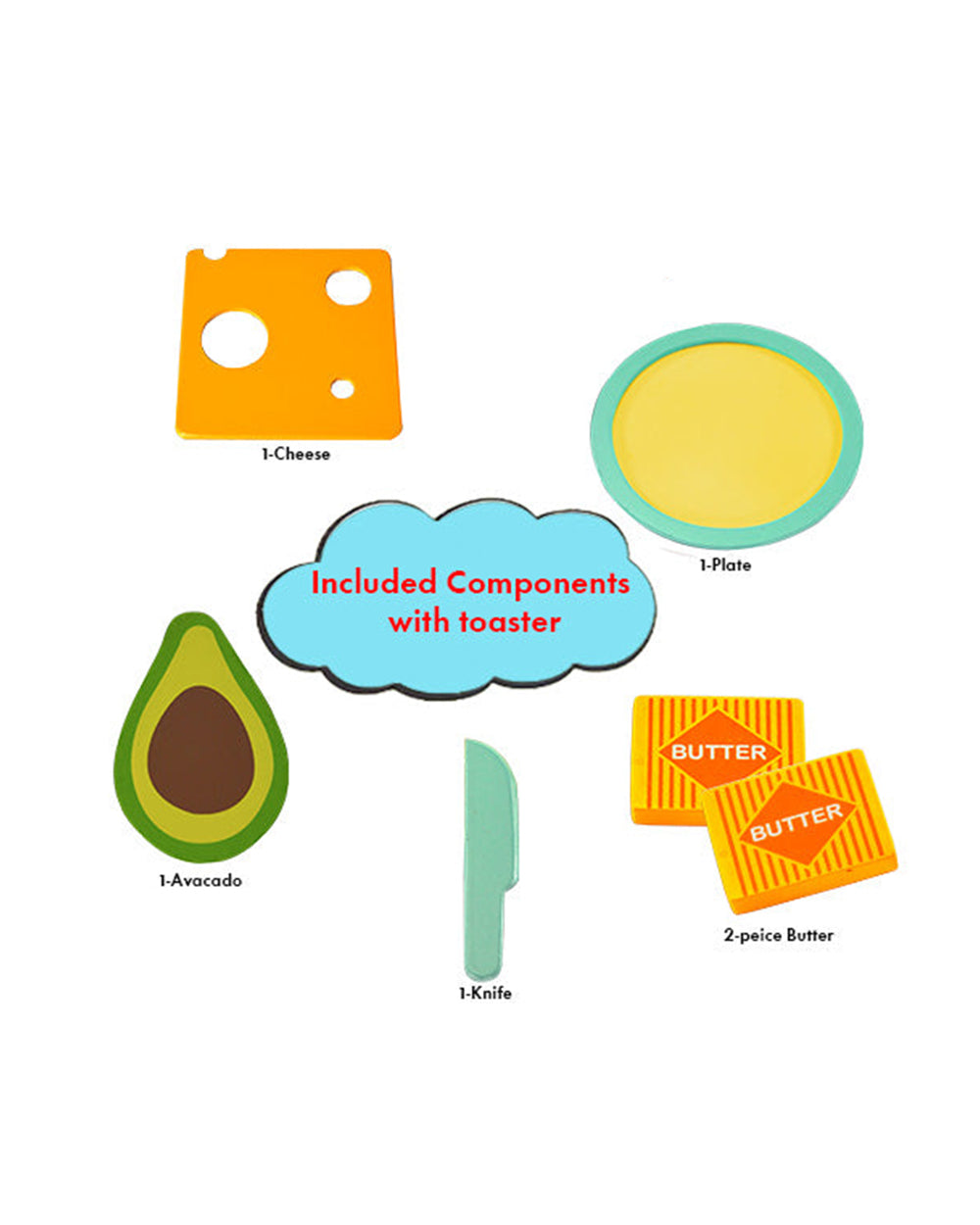 1x Toaster, 2x Pieces Breads, 1x Plate, 2x Pieces of Butter, 1x Avocado slice, 1x Cheese Slice, 1x Play Knife.