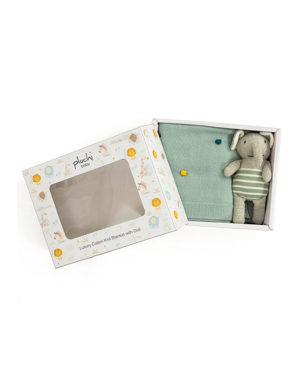Pluchi presents a delightful gift set for babies, featuring a cozy baby blanket and a soft toy, both knitted in premium cotton. This set comes beautifully packed in a box, making it an ideal gift for a special little one in your family.