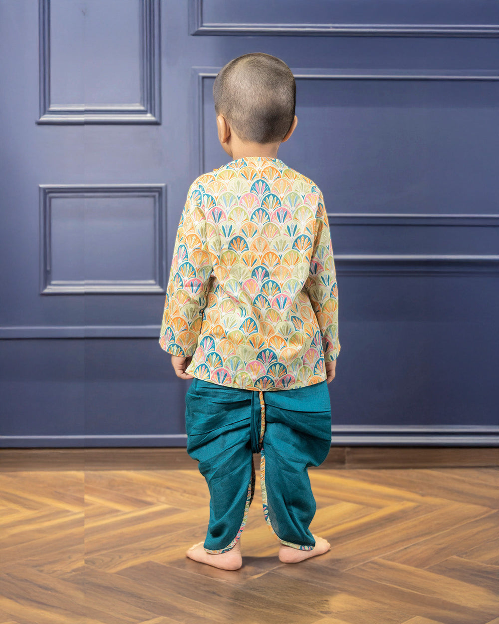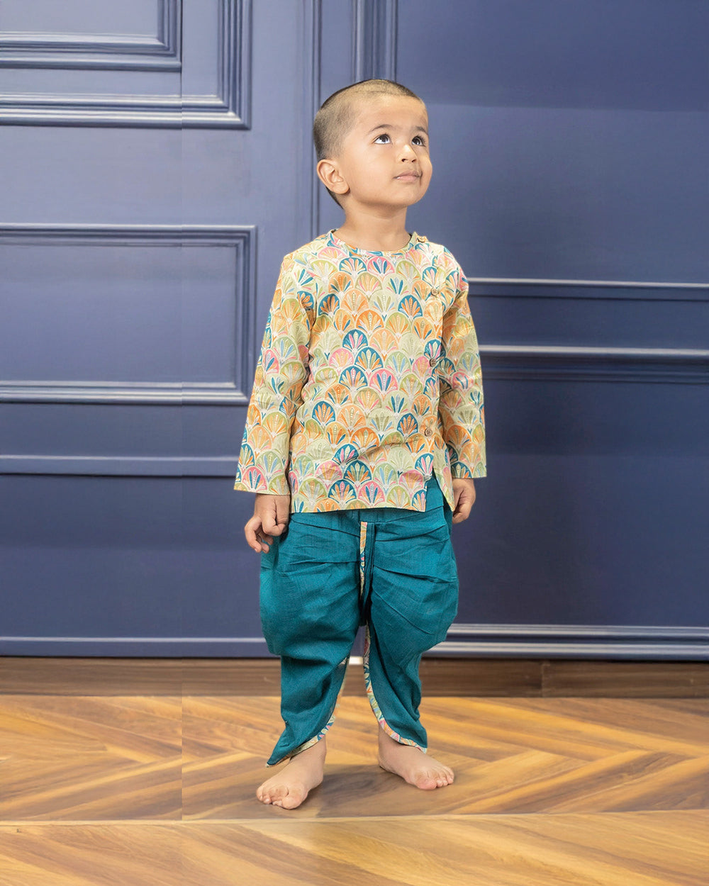 Polka Tots Blue Angrakha Dhoti Set-Floral Print-Cotton-For Infants