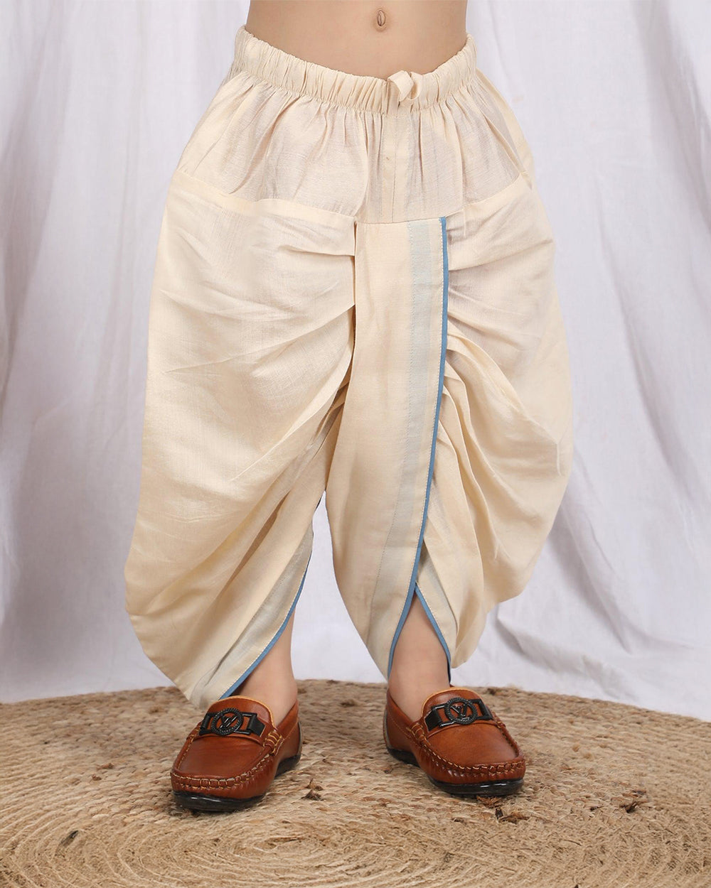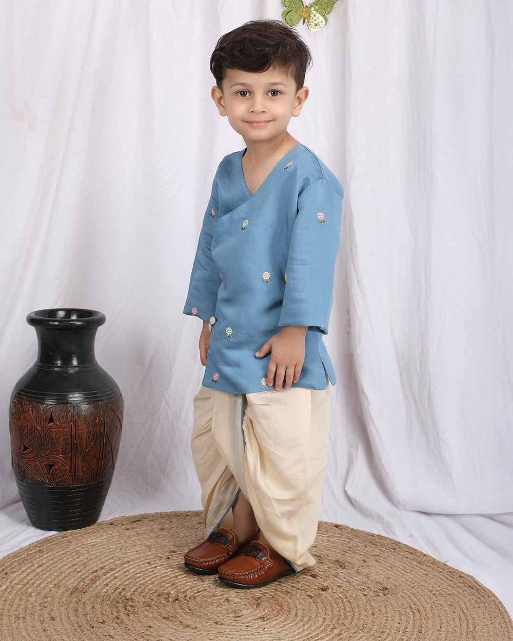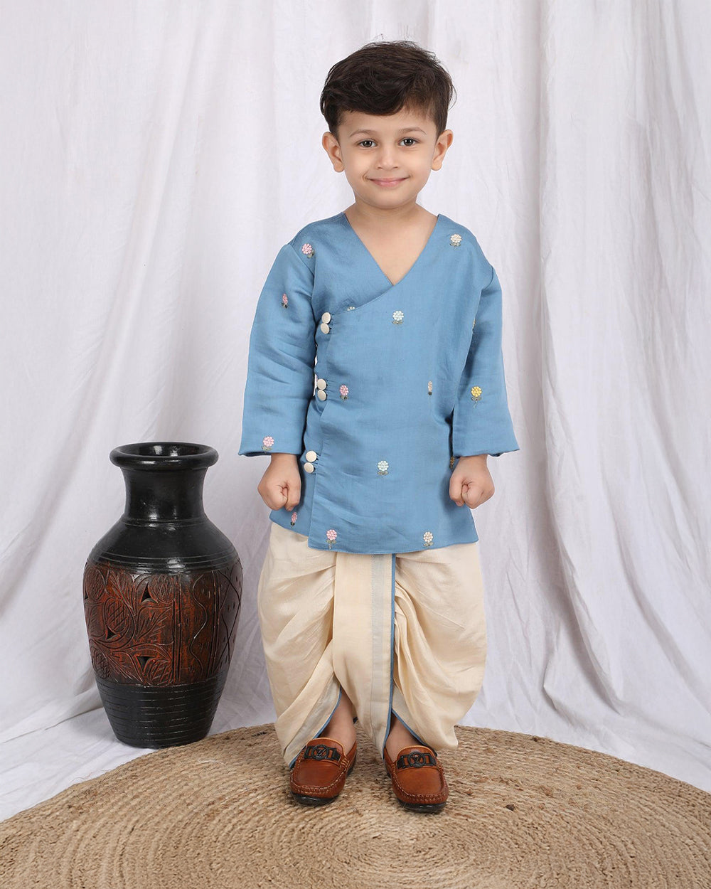 Polka Tots Cream & Blue Angrakha Dhoti Set-Silk-Embroidered-For Infants