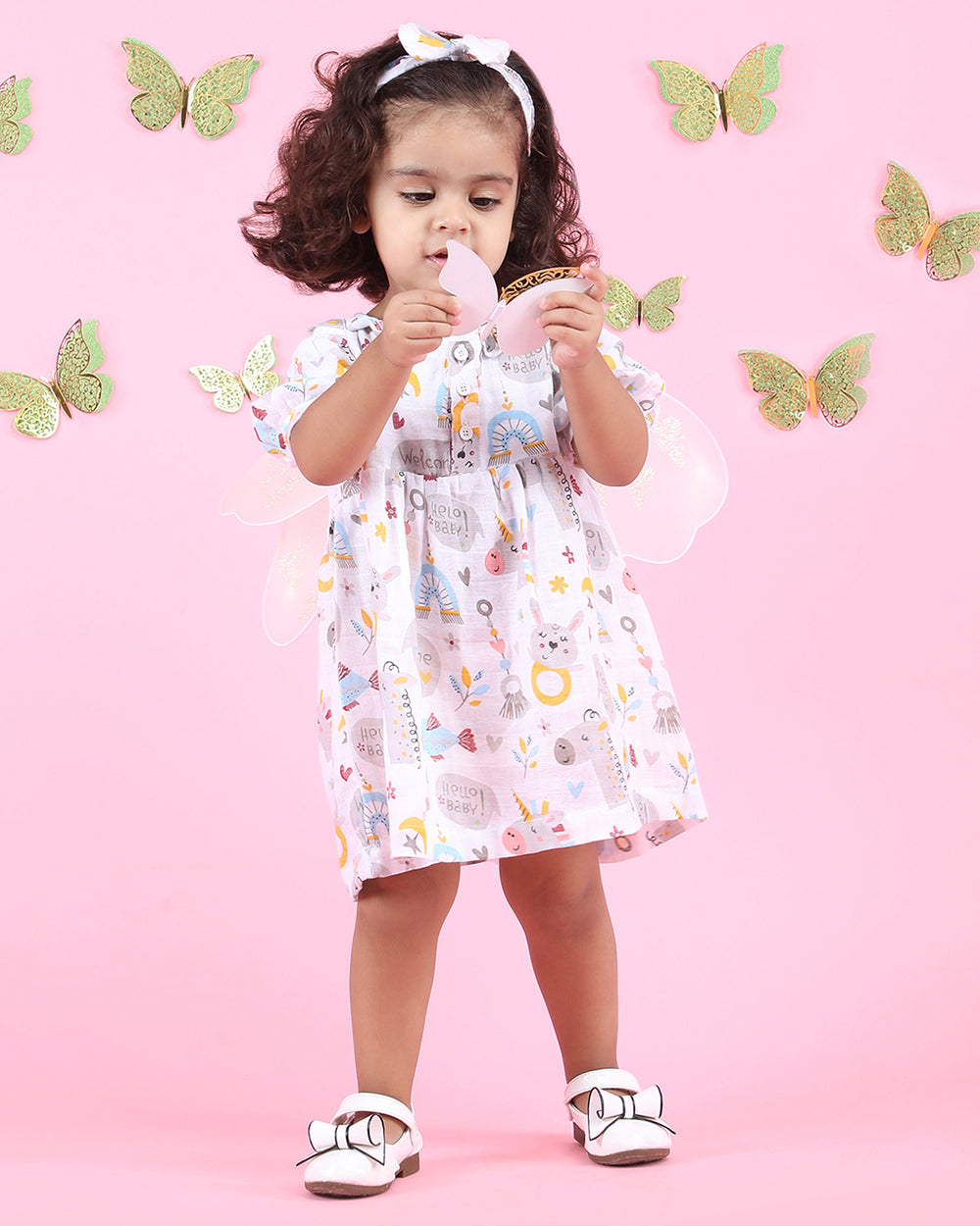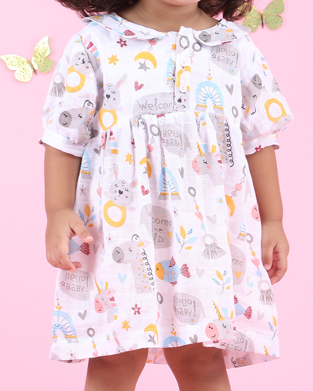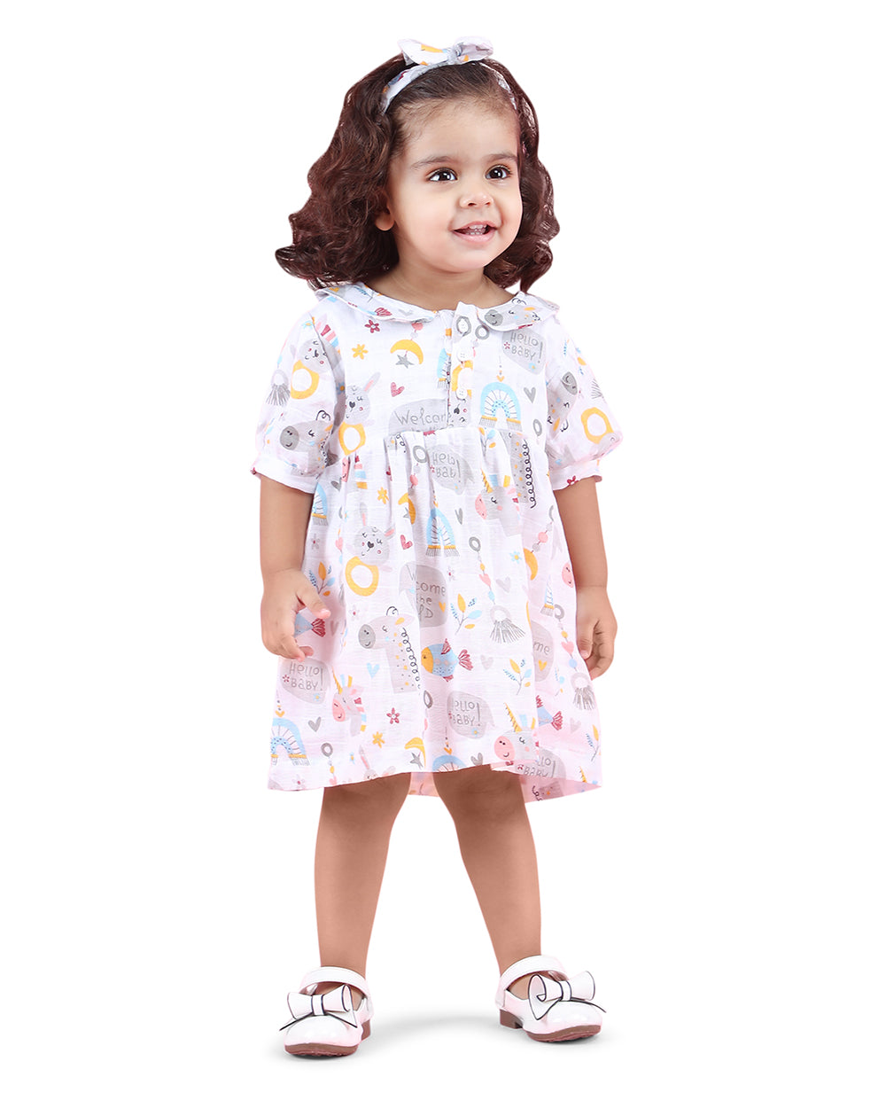 Polka Tots Multicolor Frock Dress-Hello Baby Print-Cotton Muslin-For Infants