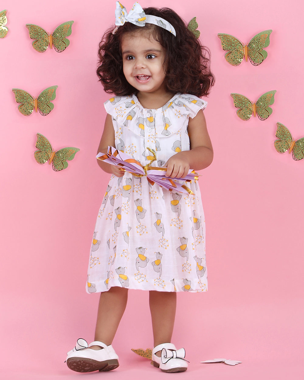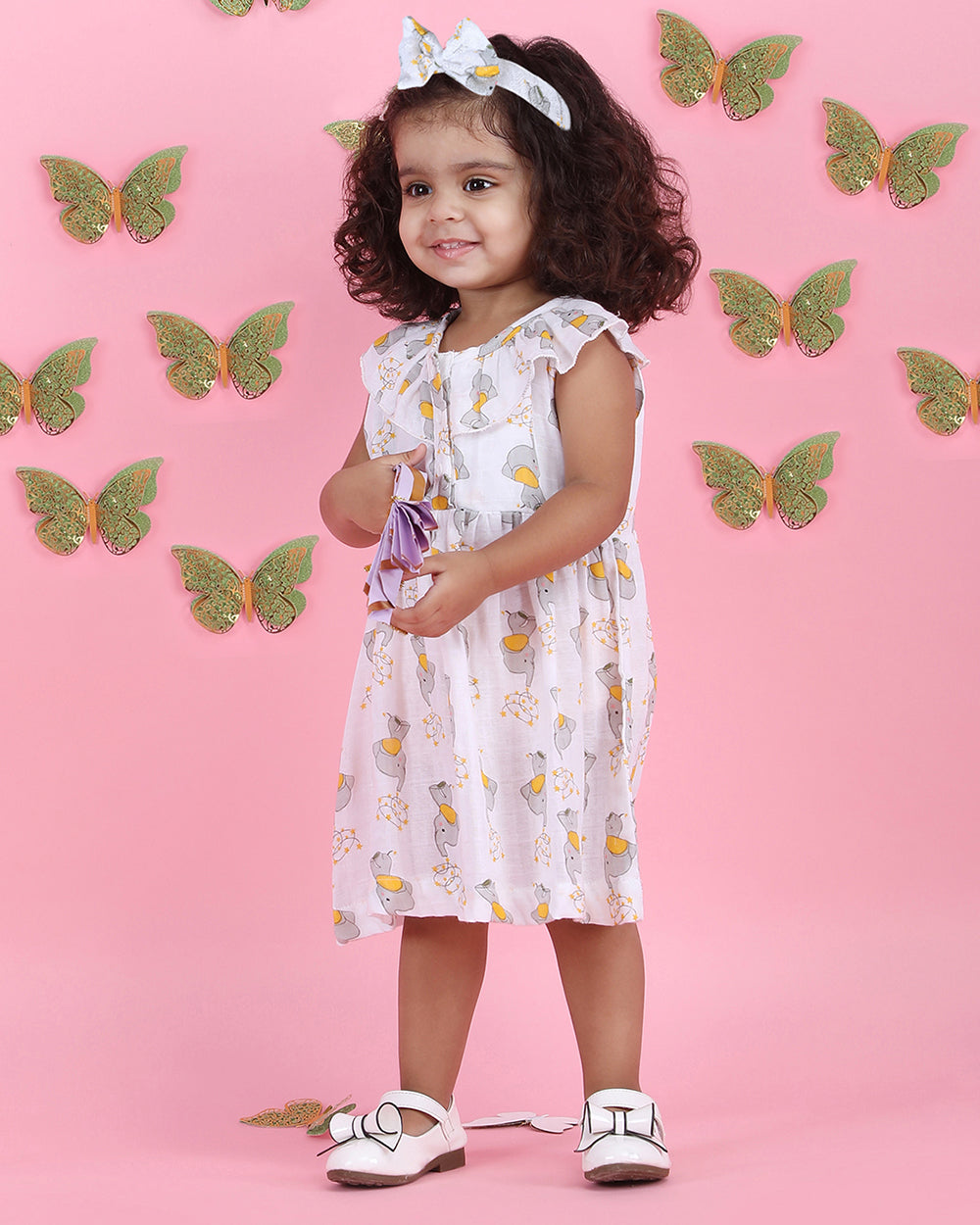 Polka Tots White Frock Dress-Elephant Print-Cotton Muslin-For Infants