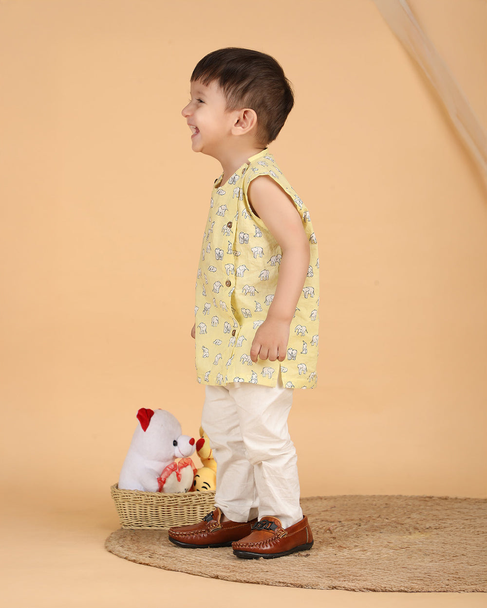 Polka Tots Yellow Jhabla Set-Elephant Print-Cotton-For Infants