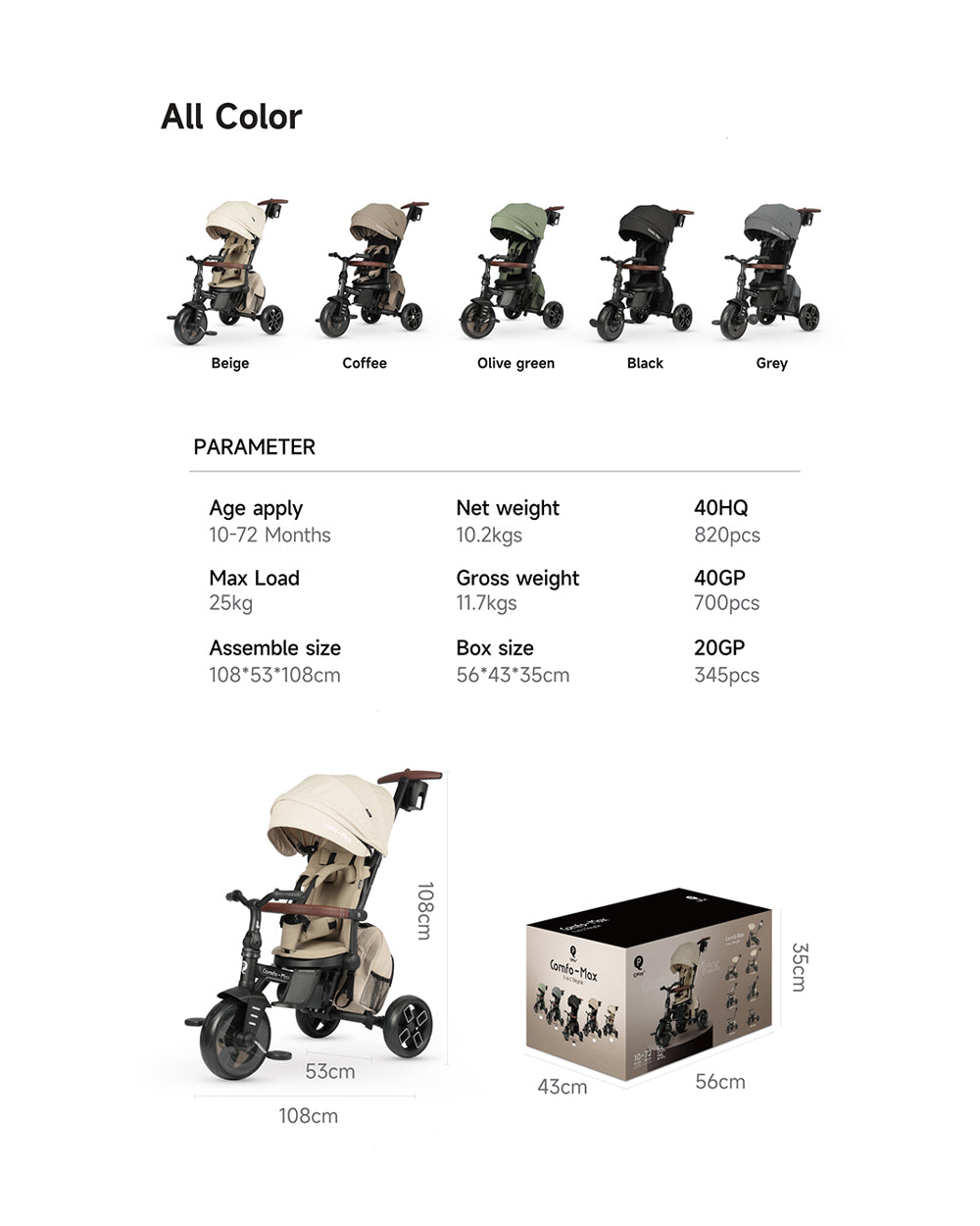 The Qplay Comfo Max 7in1 Trike is a multifunctional folding bike hybrid that evolves with your child from 10 months to 6 years. Designed for modern parents, it combines style, safety, and adaptability in one sleek package.