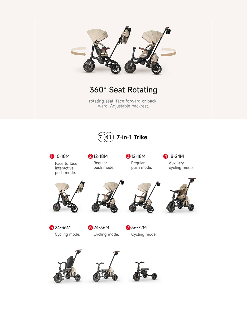 Qplay Comfo Max 7-in-1 Trike-Height Adjustable Parent Handle Bar-360 Degrees Rotating Seat-Adjustable Backrest-Foldable Frame-With Detachable Backpack-For 10M to 6Y (Upto 25 Kg)-Beige
