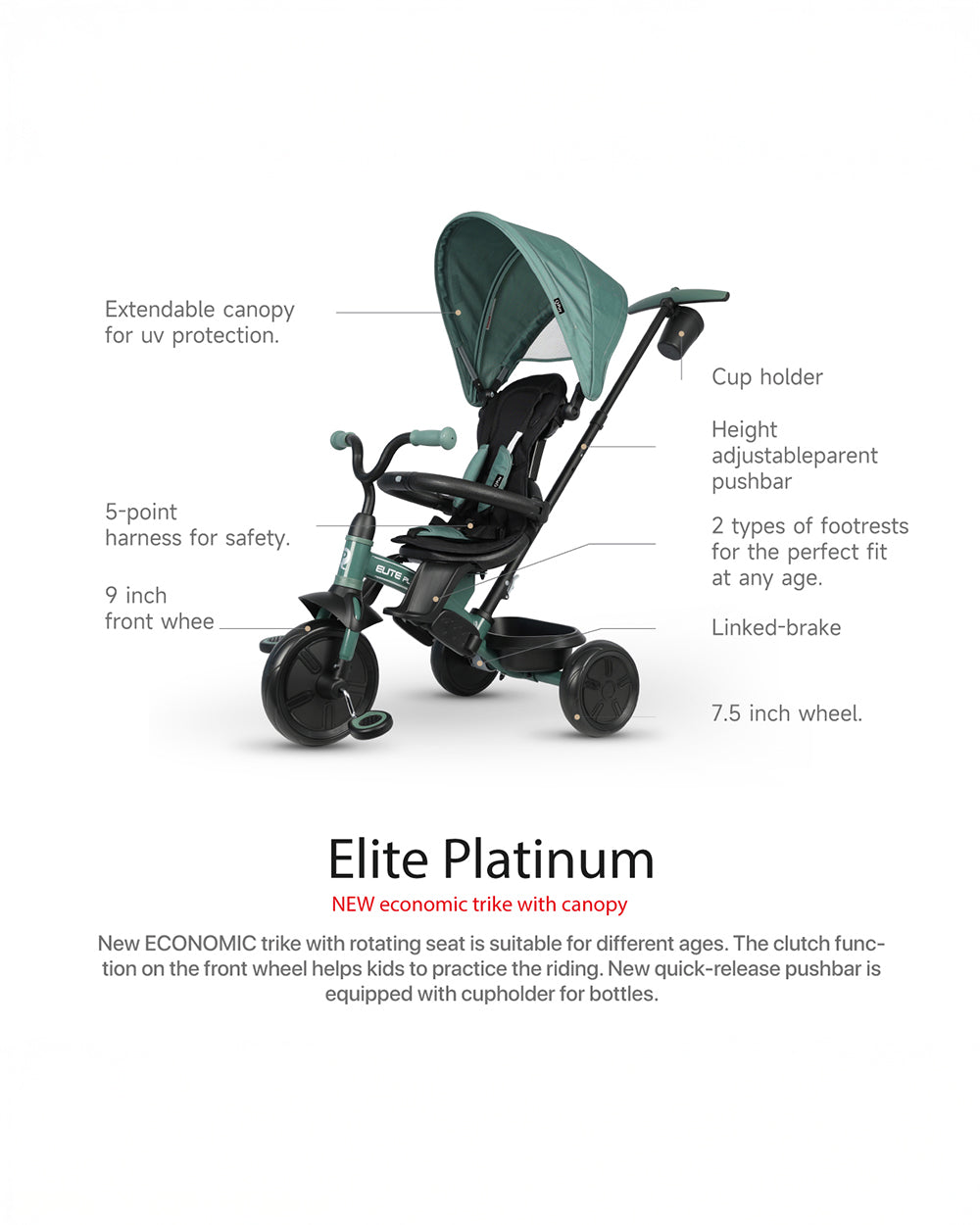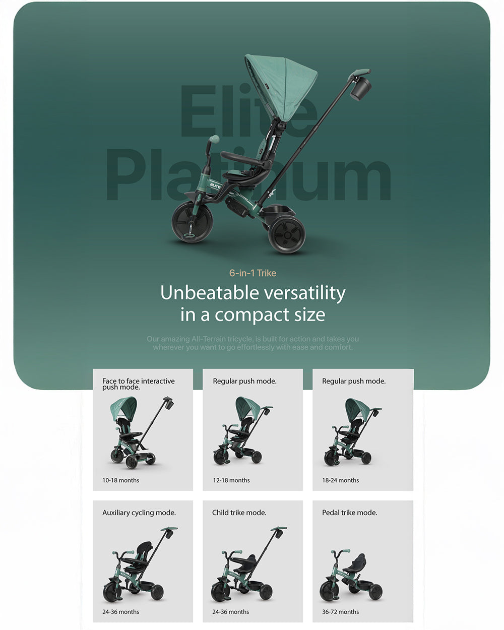 Qplay Elite Platinum 6 in 1 Trike-Height Adjustable Parent Handle Bar-360 Degrees Rotating Seat-5 Point Harness-For 10M to 6Y (Upto 25 Kg)-Green