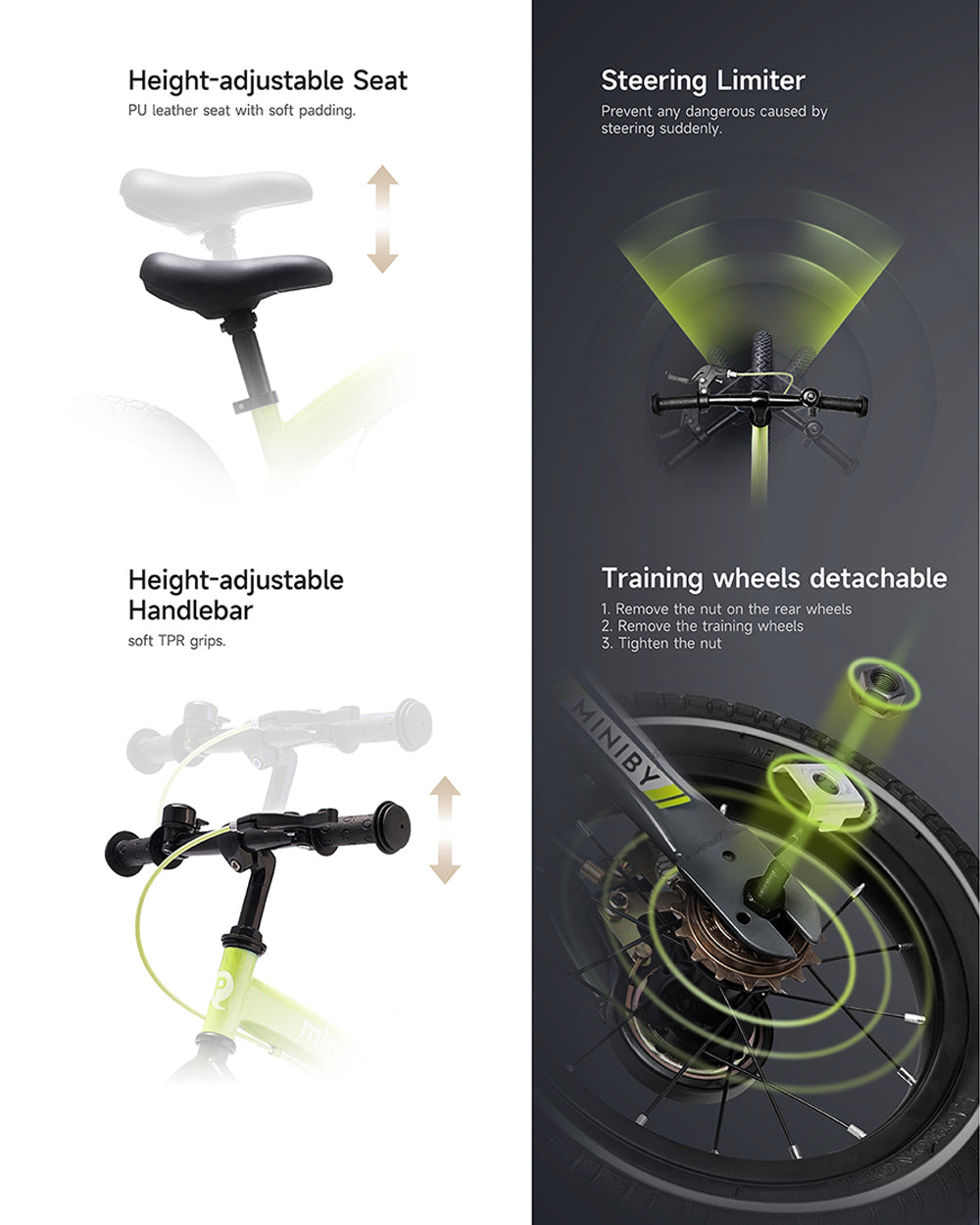 • Handlebar Rotation Limit: A built-in rotation limit on the handlebar helps prevent the bike from tipping over for added safety.
