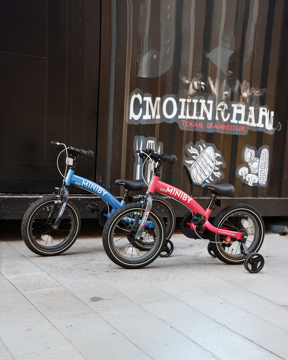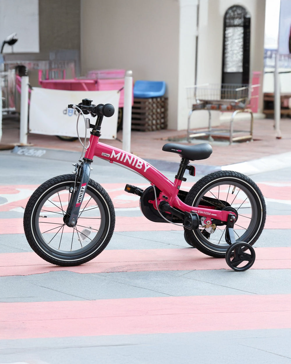 The Qplay 14-inch Miniby is a versatile and intelligently designed 3-in-1 bike that evolves with your child. It can be used as a balance bike to develop coordination, a bike with training wheels for stability, and a traditional pedal bike once they are ready. Its durable steel frame and thoughtful design make it the perfect companion for a child's early cycling journey.