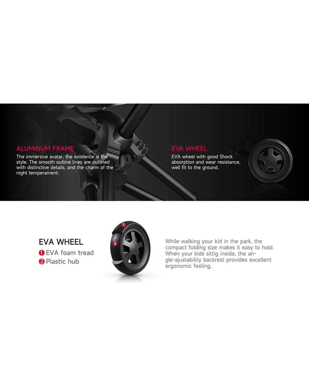 • EVA Wheels: Equipped with non-inflatable EVA wheels that provide a smooth and wear-resistant ride.