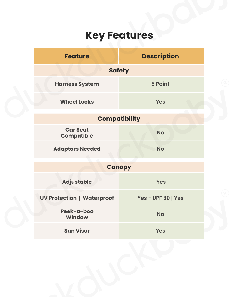 • Adjustable Canopy with UV Protection: Features a sun canopy with UPF30 protection to shield your child from the sun.