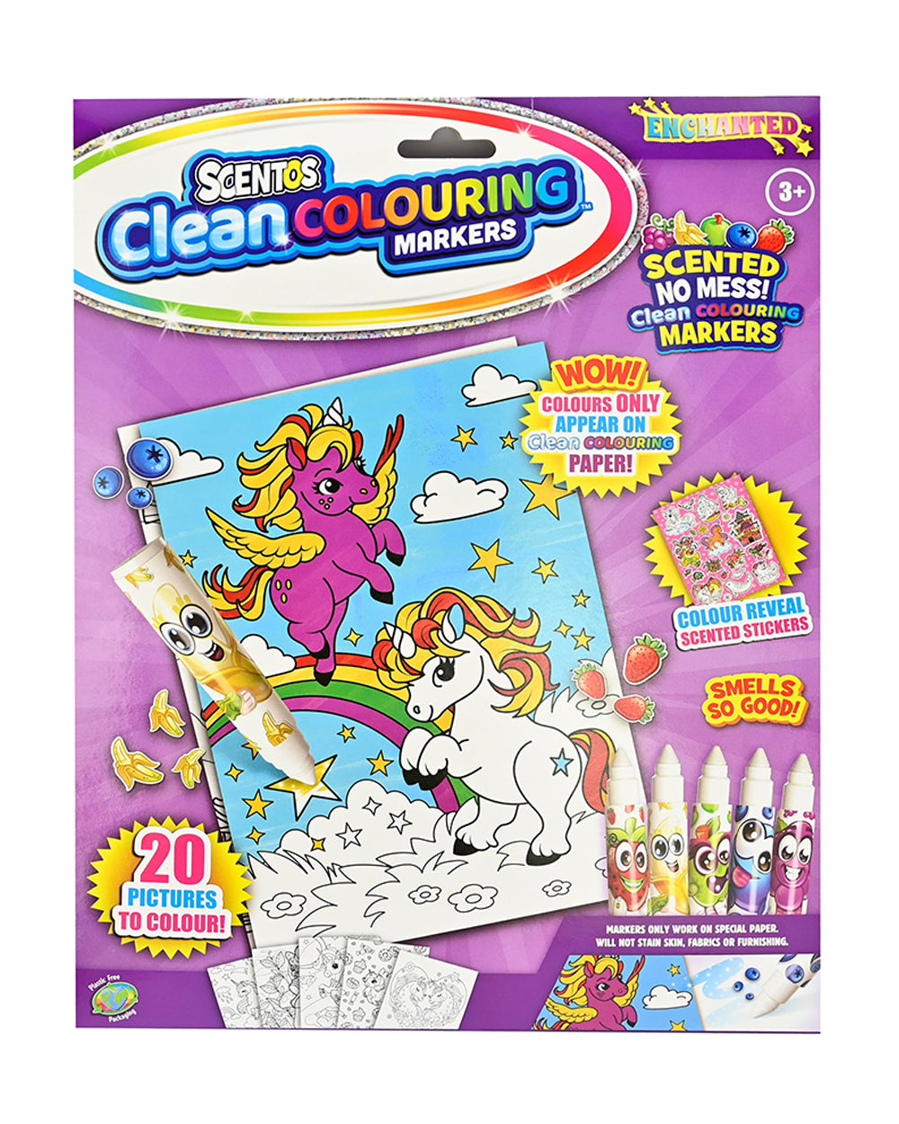Let your child explore magical creativity with the Scentos Clean Colouring Markers - Enchanted set! These no-mess scented markers bring colorful fun without the worry of stains, as the ink does not mark skin, fabrics, or furnishings. The set includes 5 fruity scented markers, 20 special clean colouring pictures, and colour reveal stickers to spark imagination and sensory play. Perfect for kids aged 3 years and above, these safe and non-toxic markers only work on the included special pages, ensuring a fun, clean, and enchanting creative experience every time.