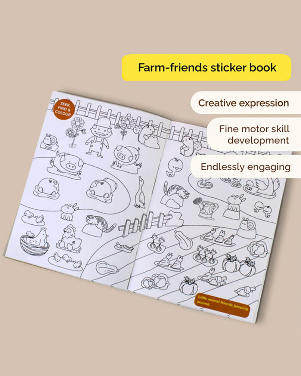 Peel, stick, and create with the Farm Friends Sticker Book – a delightful activity book designed for kids aged 3 years and up! Packed with over 200 farm-themed stickers, 8 interactive scenes, and 2 engaging seek-and-find challenges, this mess-free kit encourages creativity, boosts fine motor skills, and supports independent play. With a fun farm-themed story included, children can enjoy a screen-free, travel-friendly experience that blends storytelling with skill-building. Whether at home, during travel, or on playdates, the Farm Friends Sticker Book makes learning playful and imaginative!