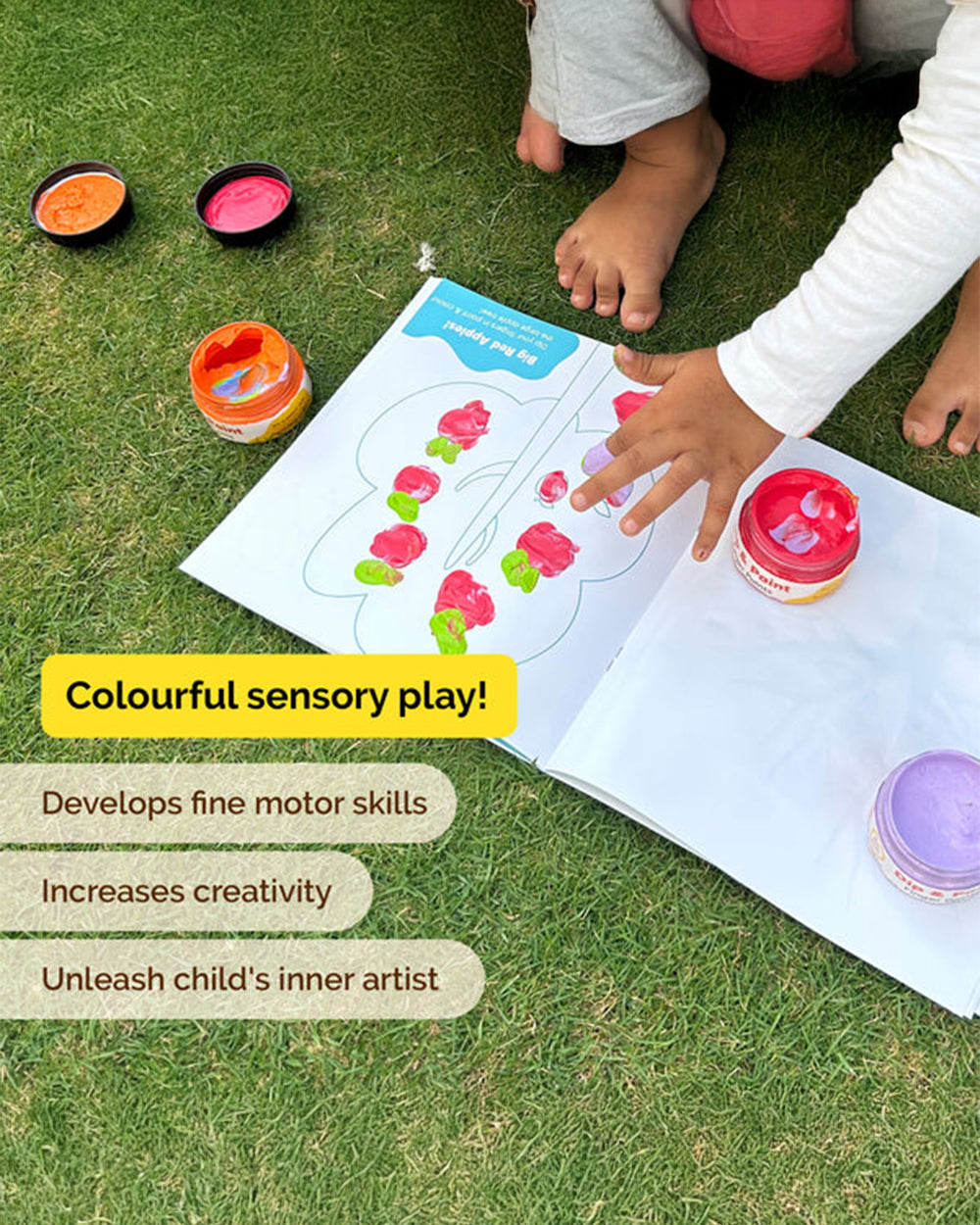 • All-in-One Finger Painting Kit: Includes 6 safe, organic, non-toxic finger paints and a 40-page activity book with guided prompts and blank pages for unlimited creativity.