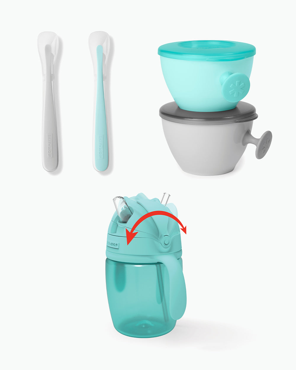 Packed with five smart solutions for easier meals with baby, our convenient set includes two serve & store bowls, two soft and gentle silicone spoons and a 2-in-1 cup that converts from sippy to straw to suit your needs. Great for home or on-the-go!