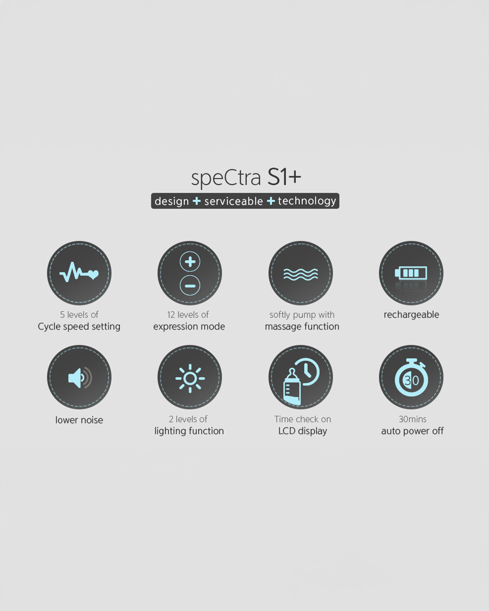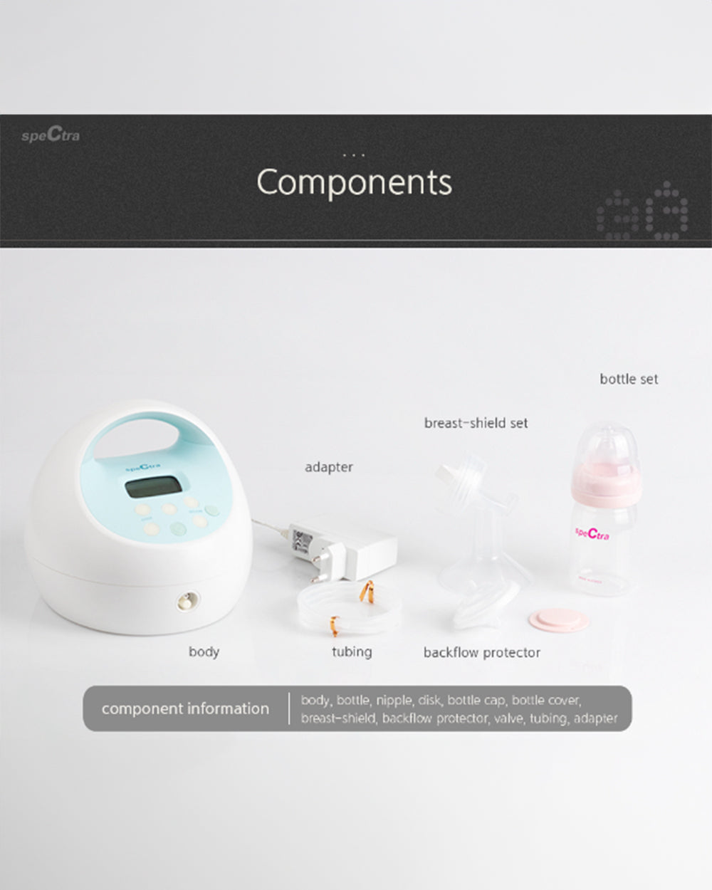 1x S1 Plus Main Pump, 2x 24mm breast flanges, 2x Backflow Protectors, 2x Duckbill Valves, 2x Spectra connection Tubings, 2x Wide Neck Storage Bottles with Airtight cap and cover (without Nipples ), 1x 5V AC Power Charger