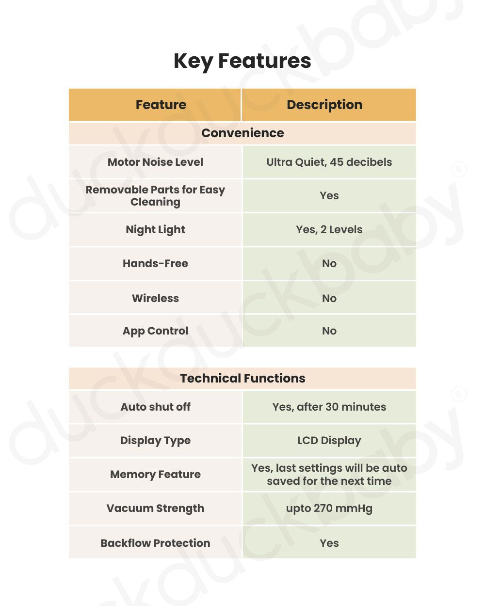 • Night Light: Allows for easy pumping at any hour, enhancing convenience.