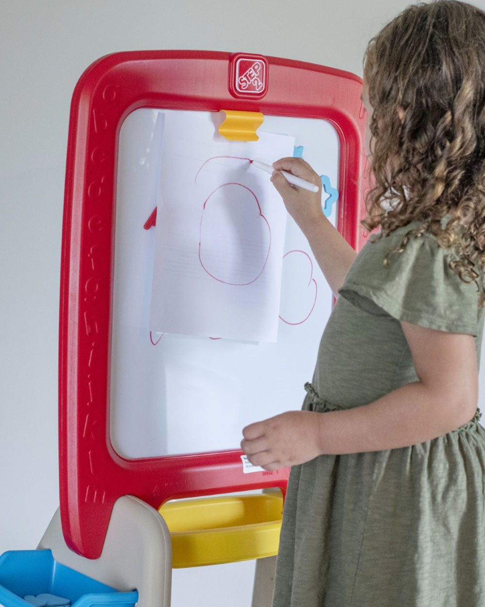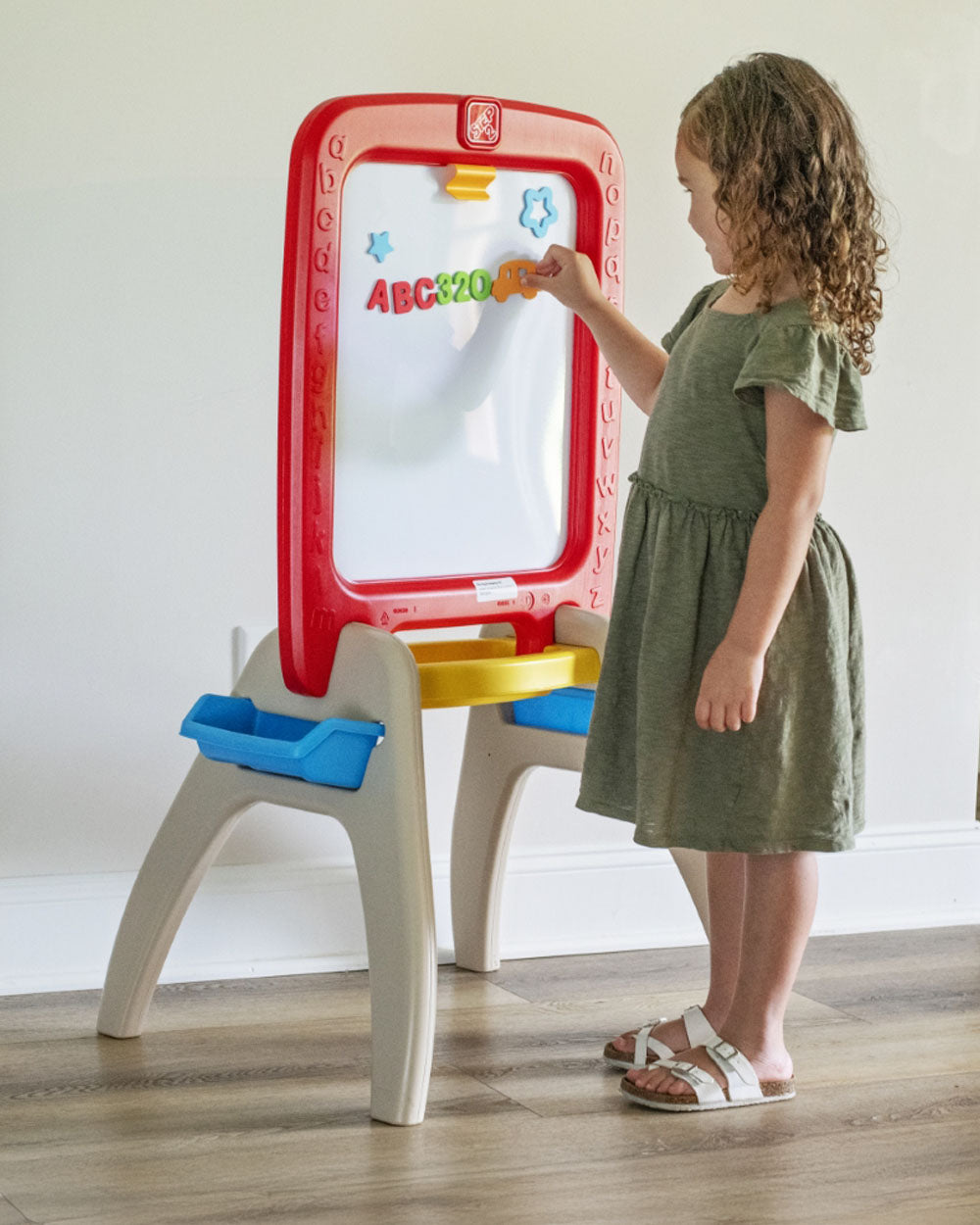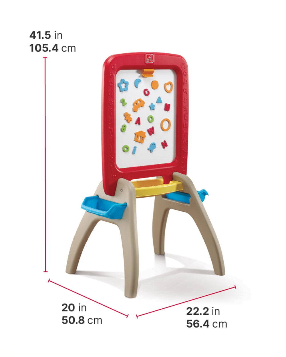 Unleash creativity with the Step2 All Around Easel for Two™ — a dual-sided art station designed for imaginative expression and interactive play. With a magnetic dry erase board on one side and a chalkboard on the other, this easel encourages drawing, writing, and storytelling. It includes a 94-piece foam magnet set featuring letters, numbers, and shapes to support early learning through play. With built-in trays and removable storage bins, everything stays organized and within reach. Perfect for solo creativity or sharing with a friend, this easel sets up quickly and folds flat for easy storage.