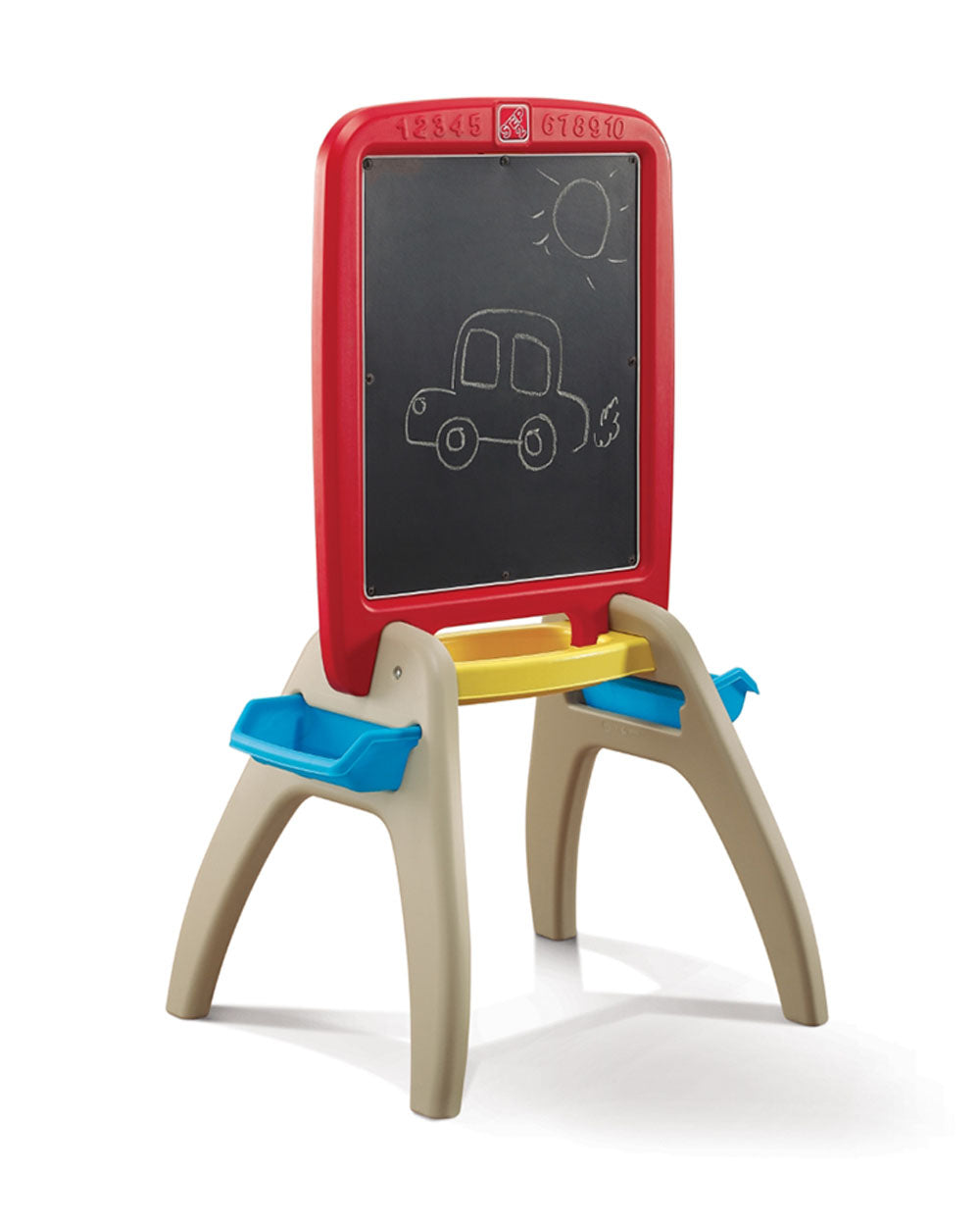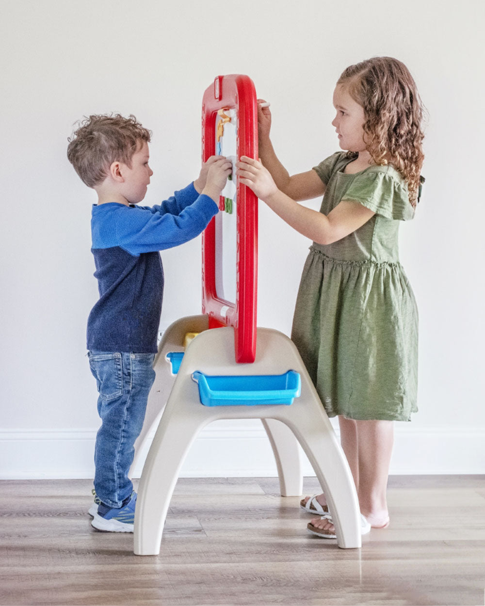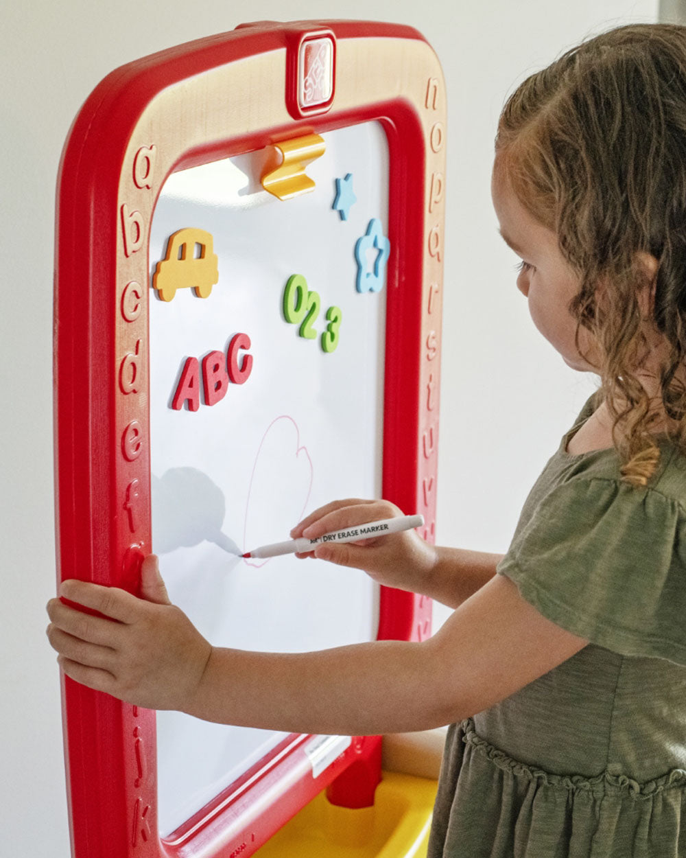 Unleash creativity with the Step2 All Around Easel for Two™ — a dual-sided art station designed for imaginative expression and interactive play. With a magnetic dry erase board on one side and a chalkboard on the other, this easel encourages drawing, writing, and storytelling. It includes a 94-piece foam magnet set featuring letters, numbers, and shapes to support early learning through play. With built-in trays and removable storage bins, everything stays organized and within reach. Perfect for solo creativity or sharing with a friend, this easel sets up quickly and folds flat for easy storage.