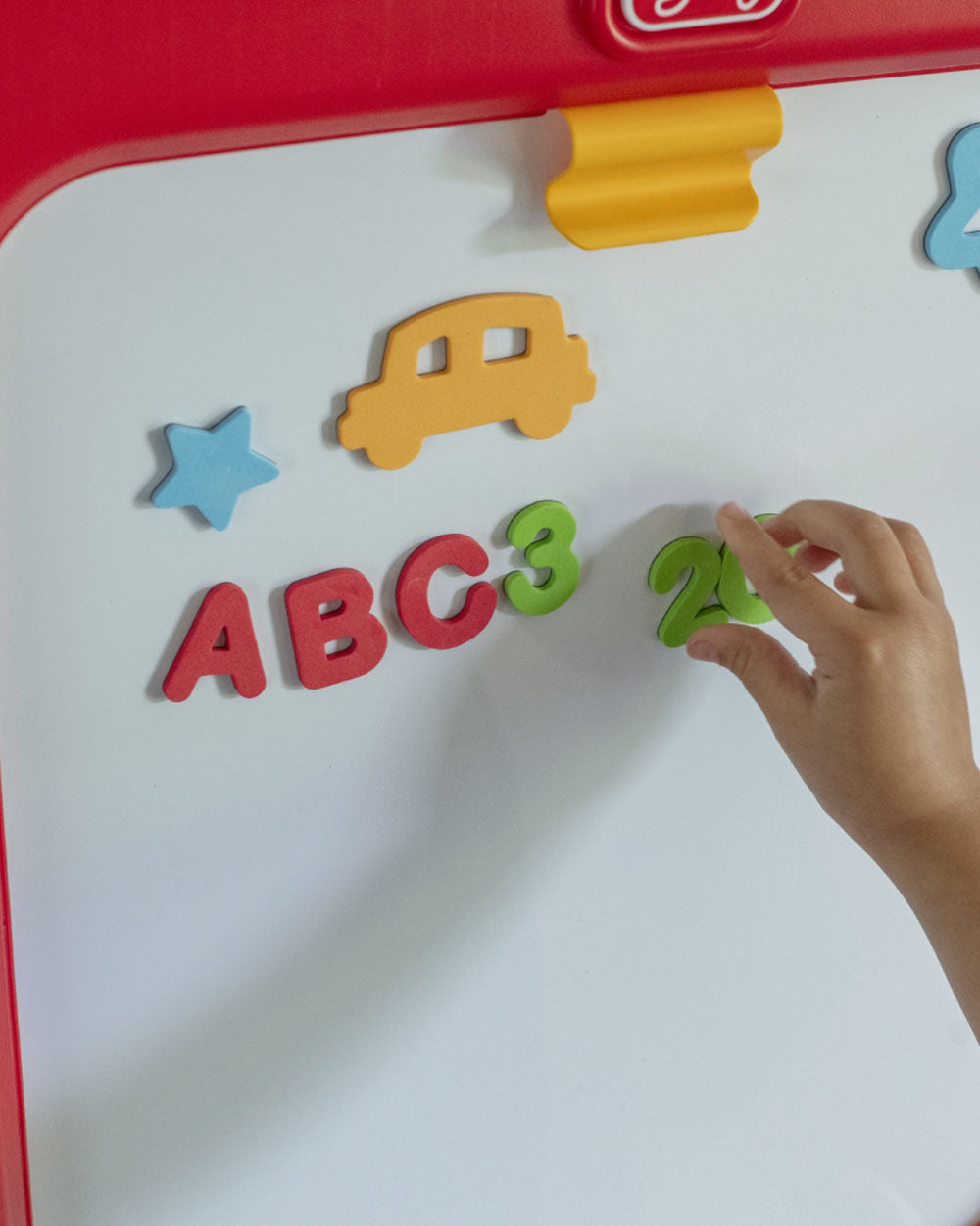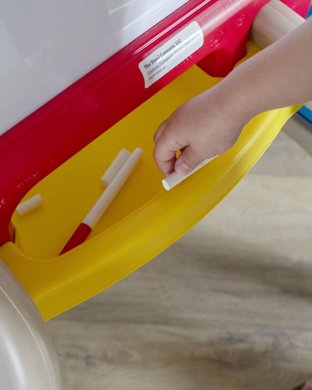 • Organized Storage: Two removable side bins and a large center tray hold art supplies and magnets for mess-free play.