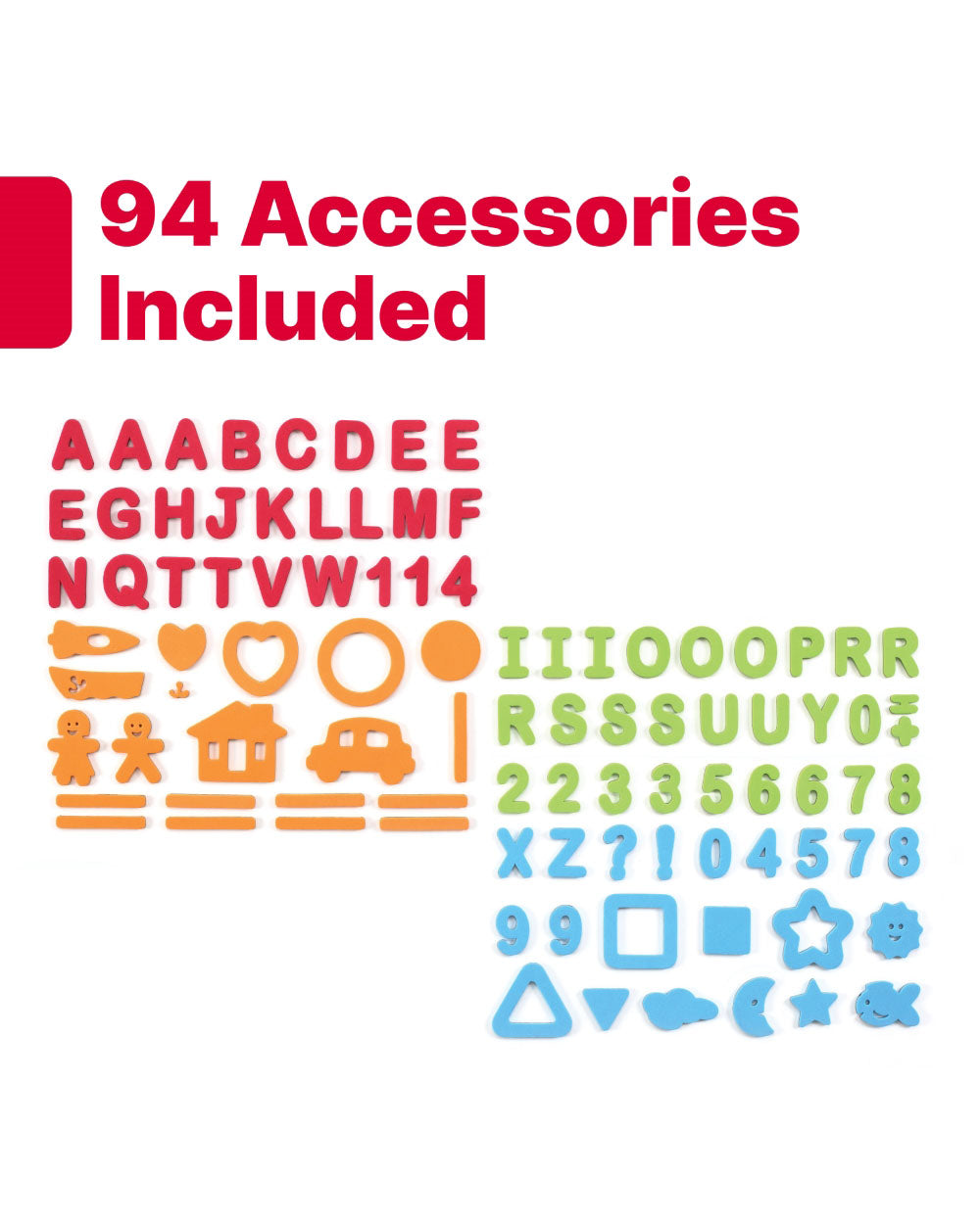 • Educational Magnet Set: Includes 94 soft foam magnets with letters, numbers, and shapes to inspire early learning.