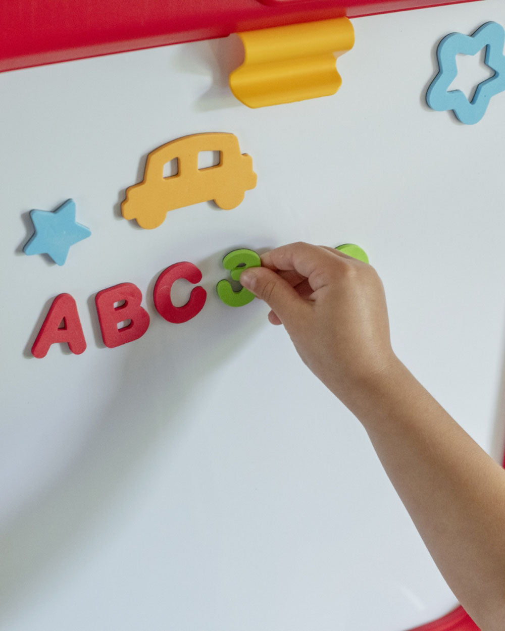 • Complete Set: Comes with easel base, double-sided art board, 2 removable trays, 1 large tray, an art clip, and a 94-piece foam magnet set.