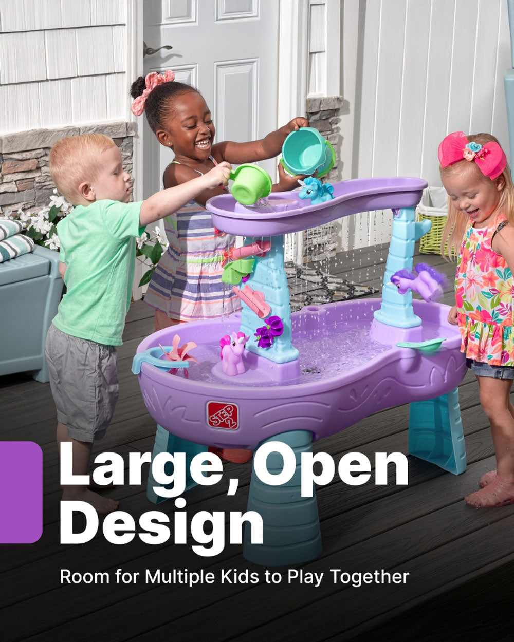 Make playtime magical with the Step2 Rain Showers & Unicorns Water Table! Bursting with pastel charm and unicorn-themed fun, this spacious water table is designed for hours of imaginative outdoor play. Kids can scoop water from the pond and pour it into the top tier to activate a rainfall effect that powers spinning maze pieces below. With a flipper launcher, rearrangeable maze trays, and 13 interactive accessories—including three adorable unicorns—this enchanting table encourages fine motor development, cause-and-effect learning, and joyful social play among multiple children.