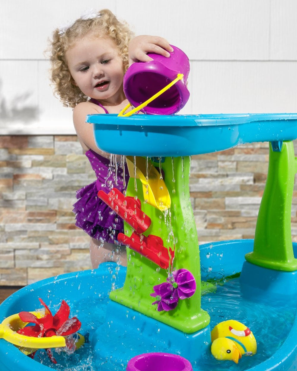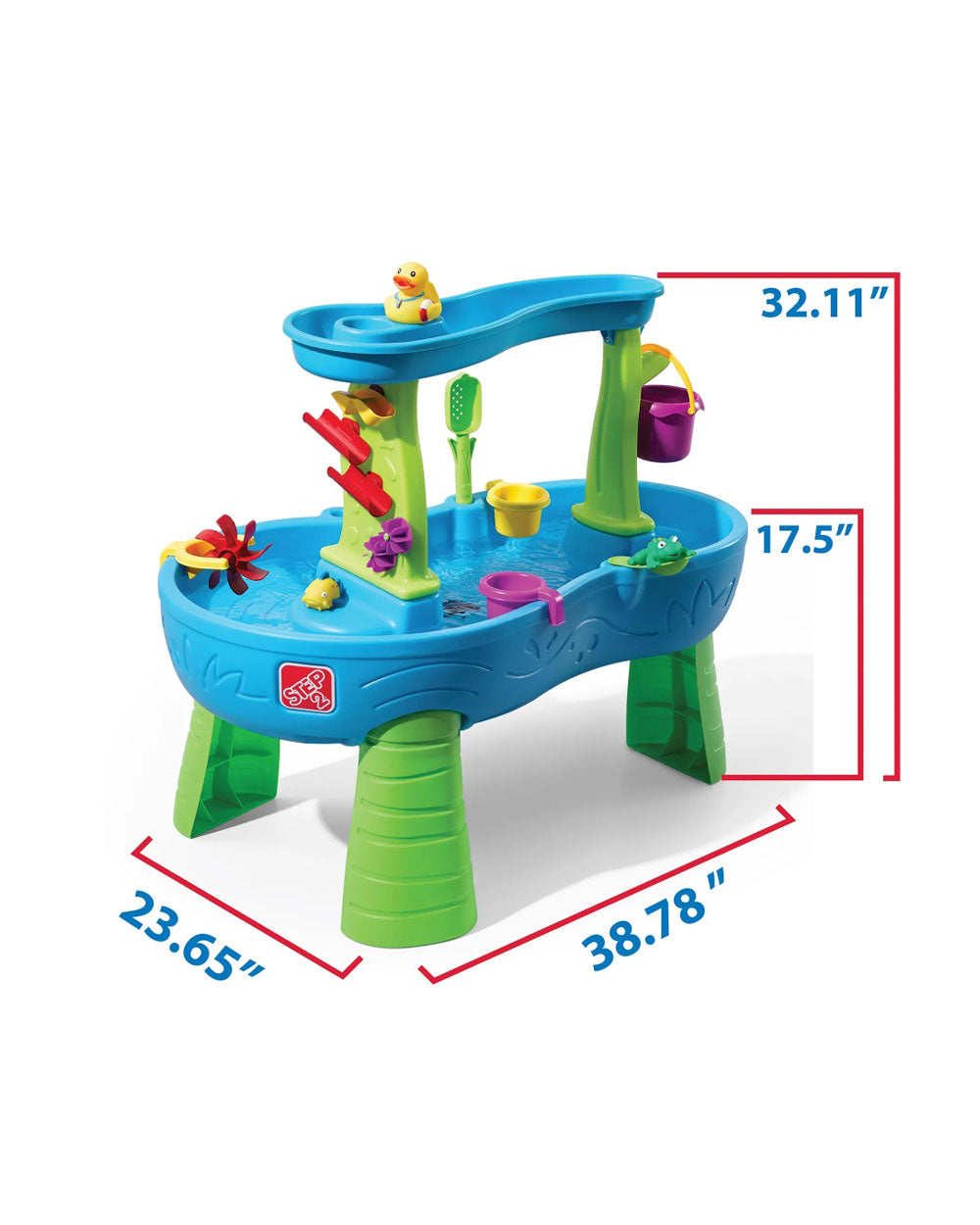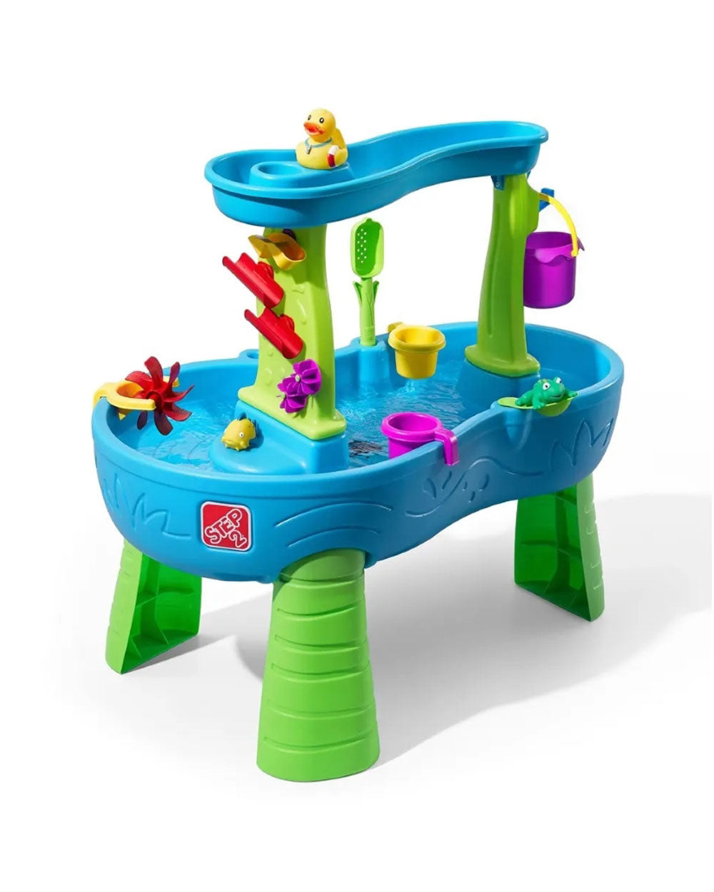 Turn your backyard into a mini water park with the Step2 Rain Showers Splash Pond Water Table™! Designed to spark imagination and encourage outdoor sensory play, this two-tier water table lets kids scoop, pour, and splash with exciting cause-and-effect features. Pour water into the top tray to activate a realistic rain shower that powers the maze-like spinners and ramps below. With plenty of space for multiple kids and 13 fun accessories—including squishy water creatures and a side flipper—this award-winning table delivers nonstop splish-splash fun while supporting social and motor skill development.