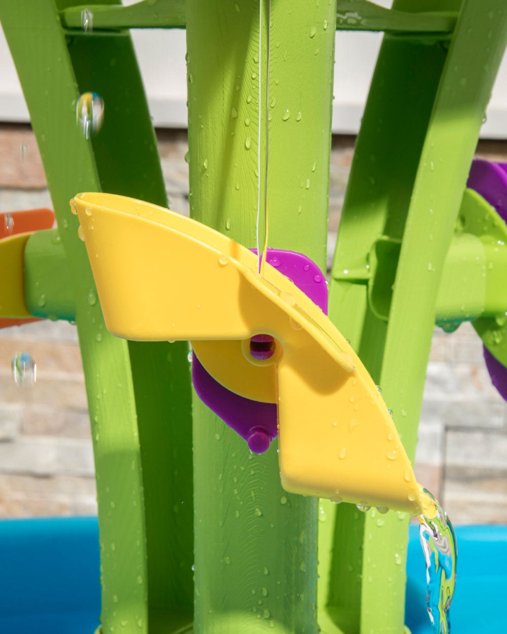• Rainfall Water Tower: Scoop and pour water into the top tray to create a fun rain shower that activates spinners below.